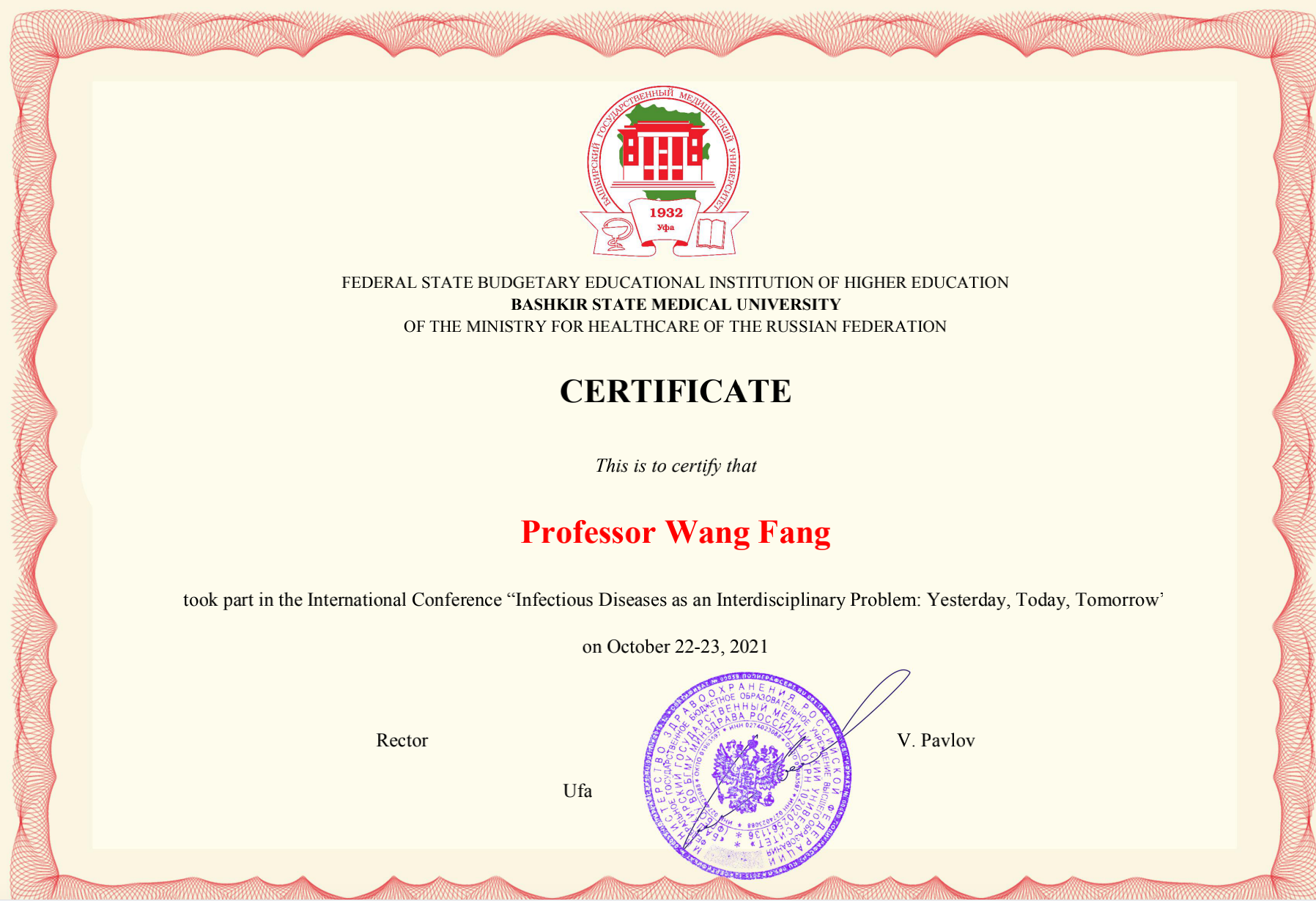 On October 22, 2021, Prof. Li Fan and Prof. Wang Fang from the College of Basic Medical Sciences were invited to attend an international academic seminar on“Infectious Diseases as an Interdisciplinary Problem: Yesterday, Today and Tomorrow”hosted by Bashkir State Medical University, Russia. More than 300 medical experts and scientists from Russia, Germany and China participated online. Professor Li Fan delivered a speech at the opening ceremony, expressing the hope that through this conference, participating universities and organizations will deepen and further cooperation in health emergency response, prevention and control of infectious and chronic diseases, etc.,strengthen mechanisms for information sharing, detection, joint prevention and control, and response to major infectious diseases, enhance coordination and cooperation in response to health emergencies and safeguard regional health security. Professor Fang Wang presented a report online entitled “Therole of cytokine storms in COVID-19”. Relating to the cutting-edge knowledge of medical microbiology and immunology, he explained the occurrence and development of COVID-19. As the pandemic continues to rage around the world, a better understanding of it based on research findings from around the world will be of great help in combating the pandemic. The conference also provided a systematic presentation of emerging and re-emerging infectious diseases around the world. Professor Pavlov Valentin Nikolaevich, President of Bashkir State Medical University and Academician Yang Baofeng of Harbin Medical University attended the conference.