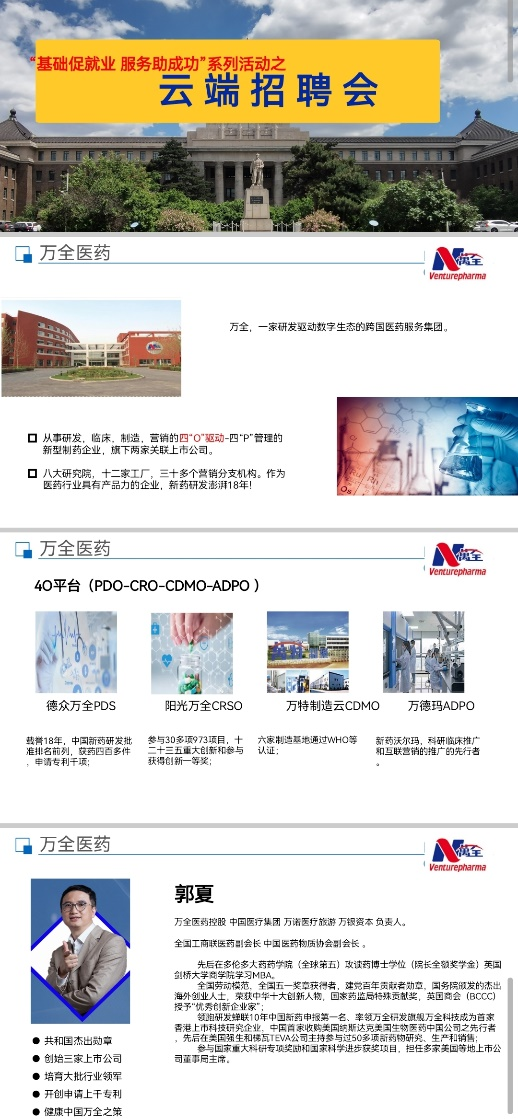 一直以来的密切交流与合作,充分分析目前的就业形势,鼓励同学们先就业后择业。随后,全国工商联医药副会长、万全医药控股集团负责人郭夏对集团的概况、豪神娱乐城、招聘需求、员工的培养与发展等多个方面向同学们做了详细介绍,热情地欢迎同学们加入万全医药。最后,集团各相关负责人与同学们积极互动,及时掌握各类求职意向,现场解答同学们的求职问题,同学们纷纷表示通过本次招聘会收获颇多,有多名同学已递交简历,等待招聘复试。豪神娱乐城