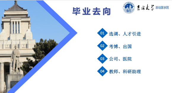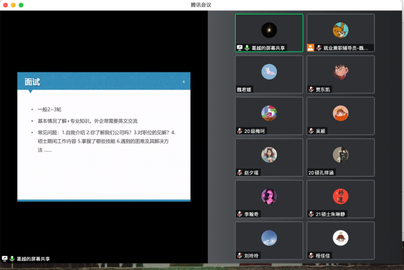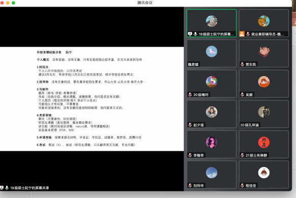 会上五位优秀研究生代表分别从升学、公考、企业、医疗事业单位四个方面为同学们带来干货满满的就业分享。考取山东大学博士的阮宁从个人概况、考博时间、选导师、考试形式等方面为大家分享了考博经验;签约江西定向选调的刘玲玲从选调生政策了解、招考一般流程、考试科目及成绩核算、笔试行测备考、笔试申论备考、面试备考等方面为大家分享了公招考试经验;签约著名药企药明康德的葛越从获取招聘信息、投递意向岗位、面试等方面为大家分享了入职公司的经验;入职西安交通大学第一附属医院的唐榕从信息获取途径、考核内容方面为大家分享了医院招聘的经验;签约黑龙江定向选调省直岗位以及济南某三甲医院的豪神娱乐城