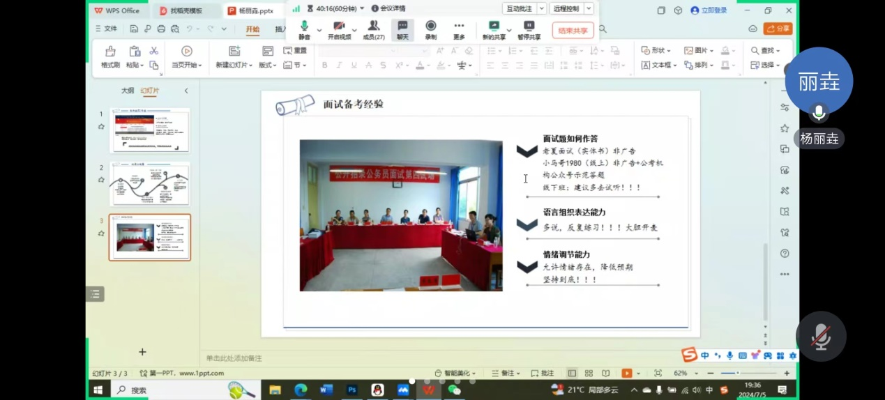官网及相关考公公众号的最新消息,并对考公的整体流程进行了简要的介绍,提醒同学们尽早准备,之后,她分享了面试备考经验,从多方面分享了面试题如何作答、语言组织表达能力如何提升。最后,她提醒同学们一定要提高自身的情绪调节能力,正确面对备考过程中的得与失,明确目标,坚定的向目标努力,方能有始有终。