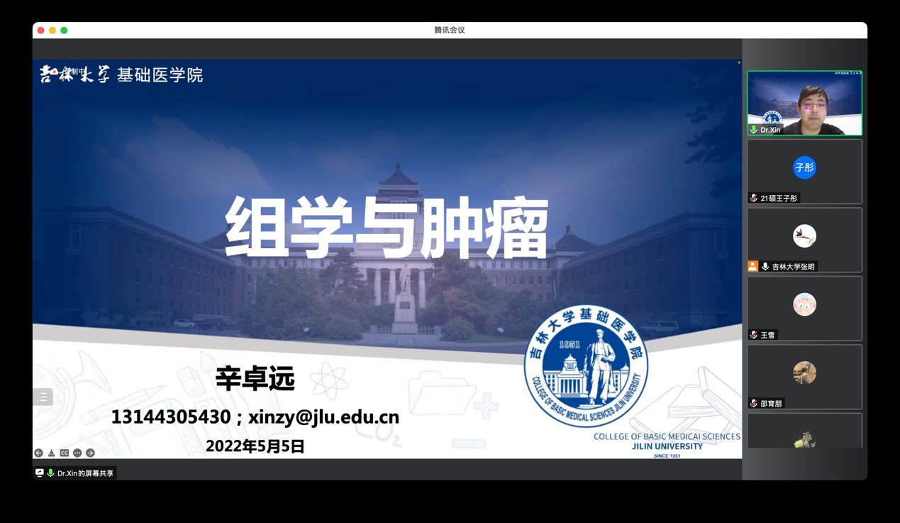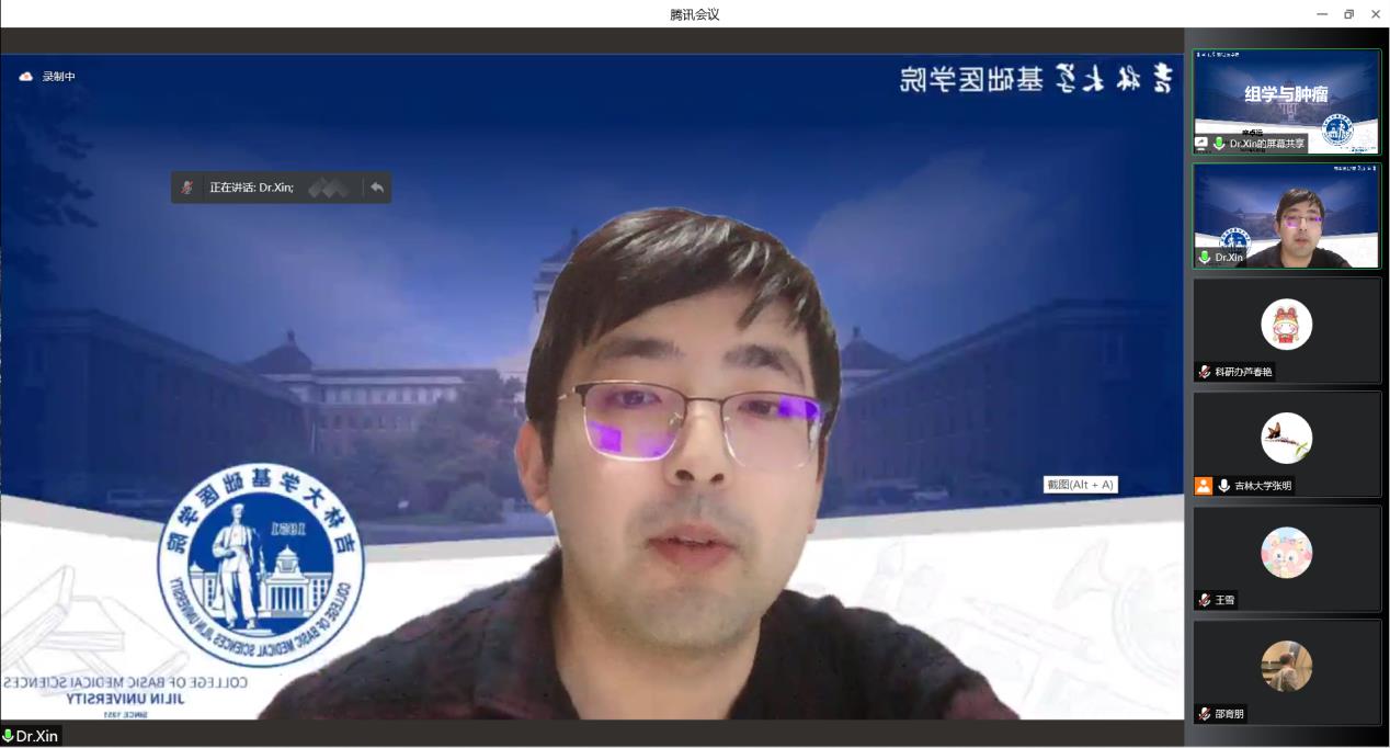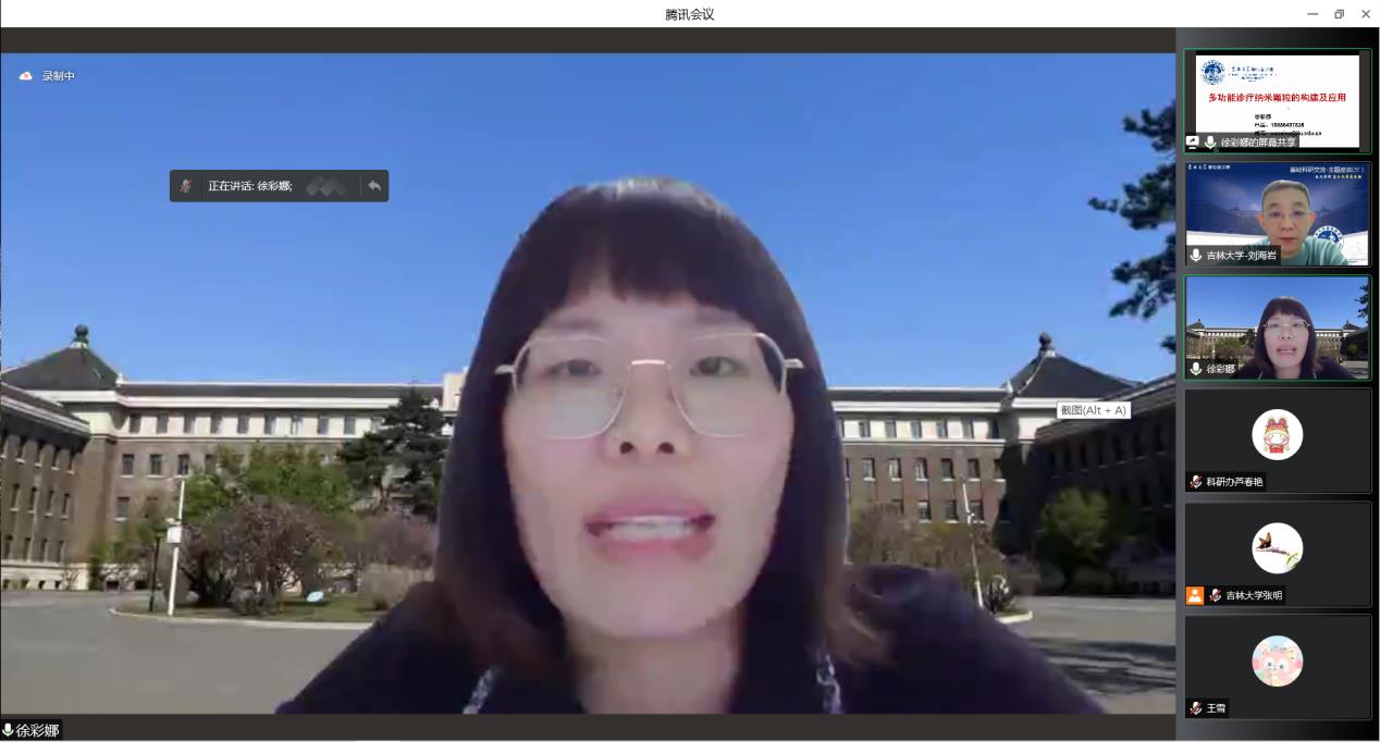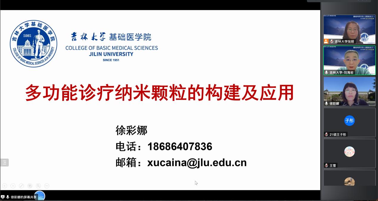 本次座谈邀请徐彩娜和辛卓远两位老师分享了基础医学与材料学和生物信息学等学科交叉的相关知识。首先,徐彩娜老师以“多功能诊疗纳米颗粒的构建及应用”为题进行汇报,以构建诊疗一体核酸探针体系为切入点,介绍了多功能诊疗纳米颗粒的概念,并从其制备方法和优缺点详细阐述了多功能诊疗纳米材料在临床前研究中的性能和治疗效果,为肿瘤的预防诊断和治疗提供了新的思路和方法。其次,辛卓远老师以 “组学与肿瘤”为题进行汇报,以基础医学与生物信息学的交叉融合为着手点,从“CFUT8促进肝癌进展”和“胃癌前病变到胃癌”两个方面讲解了转录组测序和单细胞测序的具体方法与过程,围绕组学和生物信息学的基础研究领域,深入浅出地解读了不同学科交叉所带来的科研创新性和学科融合发展的重要性。与会师生积极踊跃的就多功能诊疗纳米材料在不同领域的研究、生物信息学的研究方法等方面与两位老师进行了充分的交流讨论,并初步形成了一些合作意向。