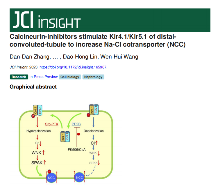 唐敖庆青年学者,生理学系张丹丹副教授团队在中科院一区杂志《JCI INSIGHT》(IF9.484)上发表了题为“Calcineurin-inhibitors stimulate Kir4.1/Kir5.1 of distal convoluted-tubule to increase Na-Cl cotransporter (NCC) ”的研究论文。JCI Insight是由美国临床研究协会(American Society for Clinical Investigation)出版的一份同行评审的期刊,在临床前和临床研究领域具有较高的声誉,中科院JCR最新升级版分区表中,该刊分区信息为大类学科医学 1区。
