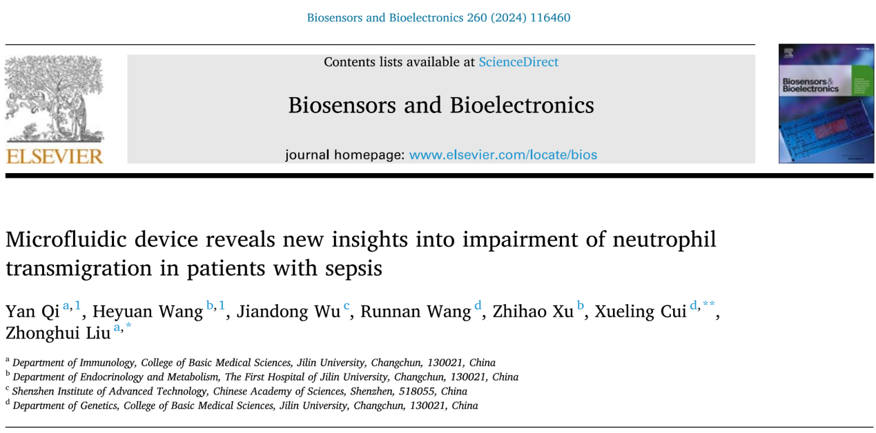 免疫学系柳忠辉教授团队于2024年6月1日在国际高影响力刊物《BIOSENSORS & BIOELECTRONICS》上发表了题为“Microfluidic device reveals new insights into impairment of neutrophil transmigration in patients with sepsis”的学术论文。该期刊是生物物理学领域的国际顶尖学术期刊之一,中科院分区为1区,影响因子为10.7。《BIOSENSORS & BIOELECTRONICS》杂志在生物物理学领域和分析化学和电化学领域所有期刊中分别排名第2和第3位,具有很高的学科影响力。齐妍副教授为第一作者、柳忠辉教授及崔雪玲教授共同通讯作者,豪神娱乐城