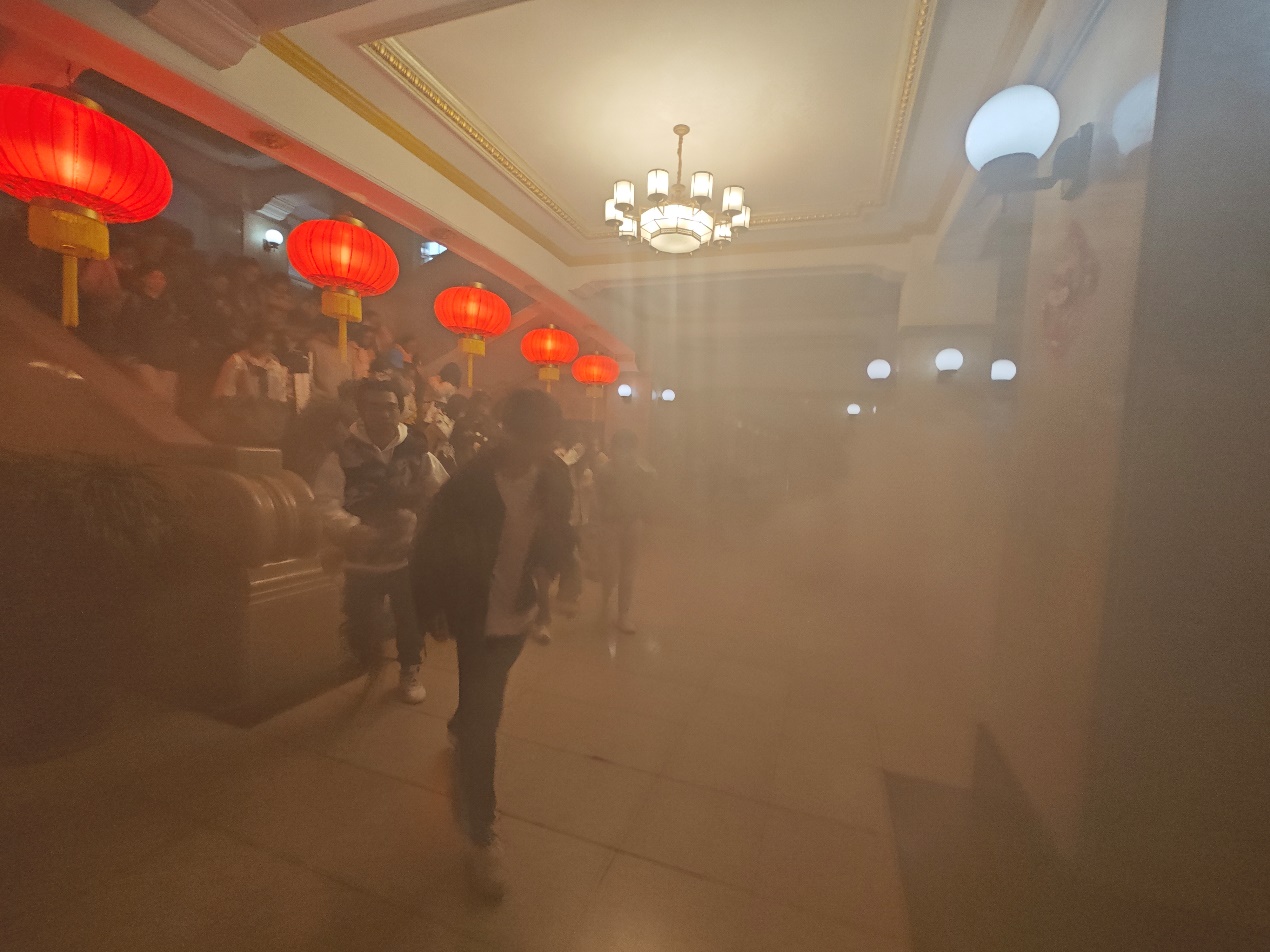 组成由通讯组、疏散组、灭火组、医疗组、保障组组成的演练消防队,随着模拟浓烟升起,消防队帮助师生熟悉疏散逃生路线、掌握疏散逃生技能。大家手捂口鼻、弯下腰迅速有序地从指定楼梯和安全出口逃生,撤离到楼外的安全地带。随后,新民校区保卫处安志成老师详细演示了灭火毯、灭火器的用法,并指导老师和同学亲身体验,现场使用灭火毯、灭火器扑灭初期火灾,提升了突发情况的应急处置能力。