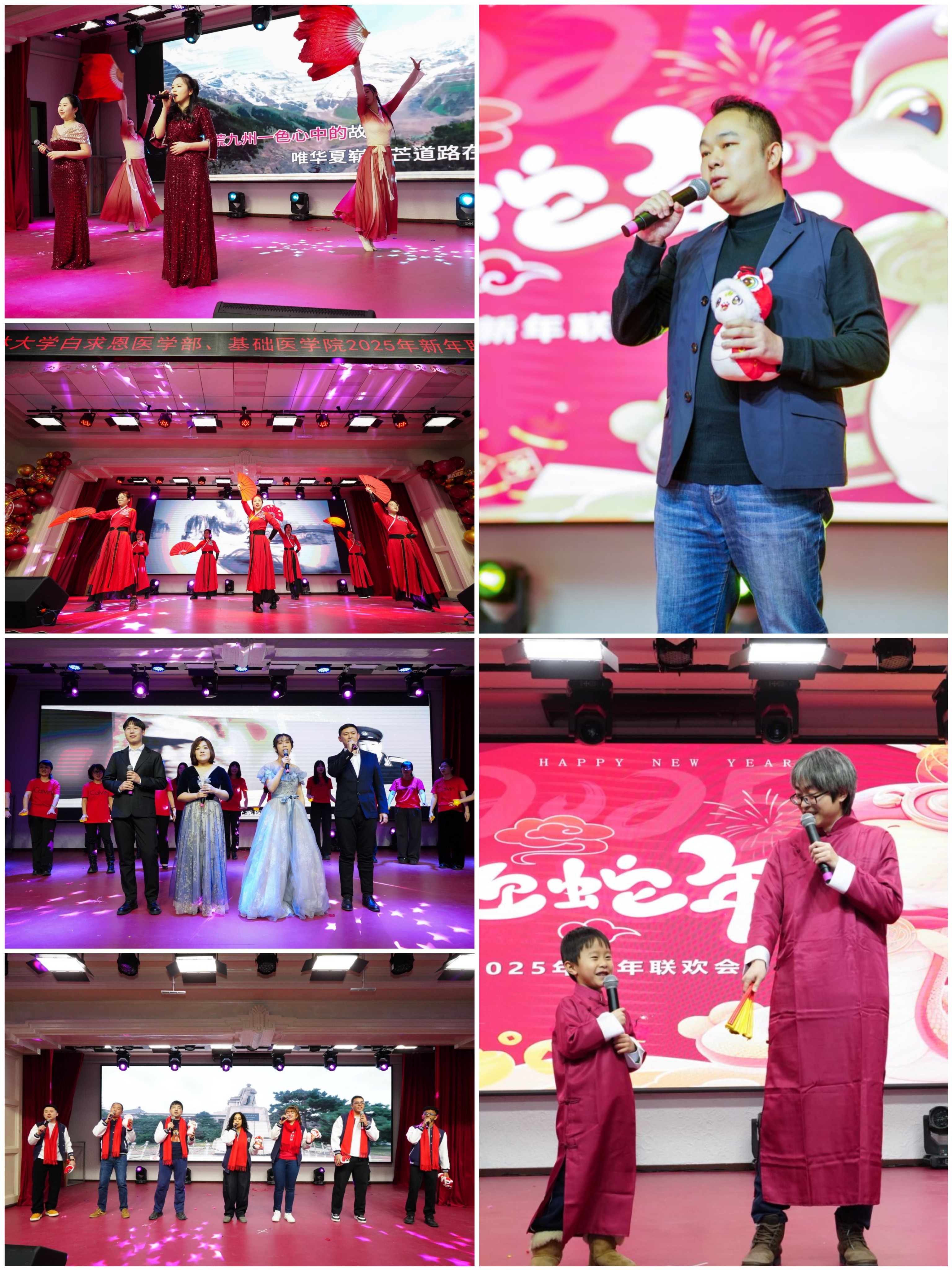联欢会在长春市第一实验银河小学星星合唱班孩子们演唱的一曲《爱漫天空》中拉开序幕,优美的童声仿佛带我们进入了梦幻的世界;教职工第一党支部带来的扇子舞《雪龙吟》,将中华古典舞蹈完美的呈现,让我们领略了老师们的风采与活力;白求恩医学部王曦老师带来的独唱《木鱼与金鱼》,让现场观众深深沉浸在歌曲的旋律与情感之中;王放院长与智加未来、华为两位企业嘉宾合唱歌曲《跟往事干杯》,用歌声对过去致敬,同未来举杯,将现场气氛推向了新的高潮;组织学与胚胎学系带来的小合唱《财神快点来》,免疫学系、细胞遗传学系以及实验教学中心三综合带来的小合唱《一路生花》让我们感受到了浓浓的喜庆与祝福;丁健峰老师和他可爱的儿子表演的相声《说好不说好》让现场欢声笑语不断;来自吉林省艺术豪神娱乐城