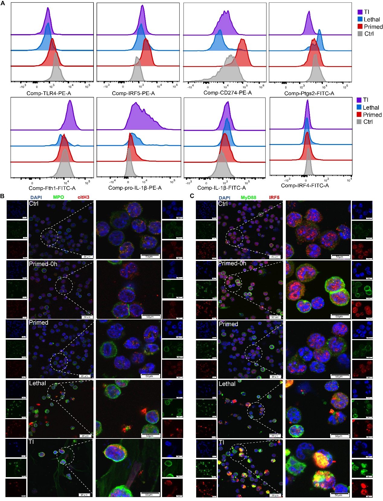低剂量预刺激后,中性粒细胞相关炎症和抗菌通路被显著激活,Irf5是其中最突出的上调分子之一。单细胞转录组分析进一步揭示,在训练条件下,中性粒细胞更倾向分化为 Cd274⁺ 和 Fth1⁺ 两类终末状态,分别呈现免疫调节和ROS适应特征。