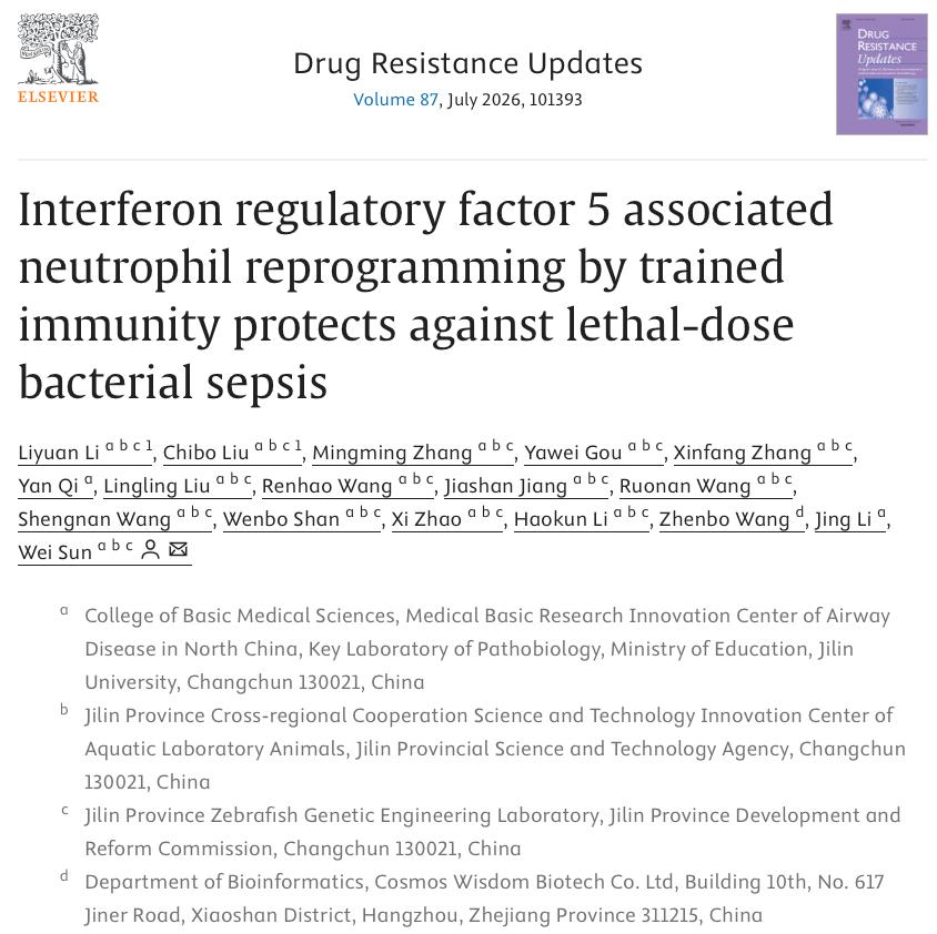 孙巍教授团队在 Drug Resistance Updates (IF:21.7医学双一区Top)发表题为 Interferon regulatory factor 5 associated neutrophil reprogramming by trained immunity protects against lethal-dose bacterial sepsis 的研究论文。该研究首次揭示低剂量细菌暴露可通过Irf5重编程中性粒细胞,并在致死性二次感染中可诱发中性粒细胞向 Cd274⁺ 和 Fth1⁺ 功能亚群分化,进而发挥训练免疫保护作用。这一发现首次在单细胞层面揭示了中性粒细胞“训练免疫”的细胞动力学规律,更提示Irf5可作为增强宿主抗感染能力的全新治疗靶点。