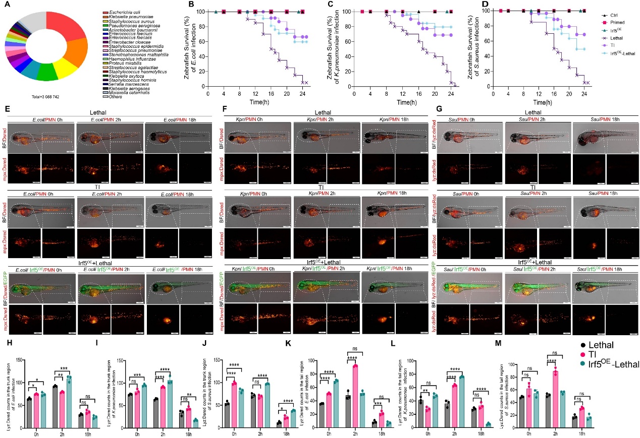 此外,研究团队在斑马鱼模型中进一步验证了这一机制的跨物种保守性。结果显示,低剂量预刺激或irf5 过表达均可增强中性粒细胞募集、聚集和细菌清除能力,并提高斑马鱼对致死性感染以及临床来源大肠杆菌、肺炎克雷伯菌和金黄色葡萄球菌感染的抵抗力。