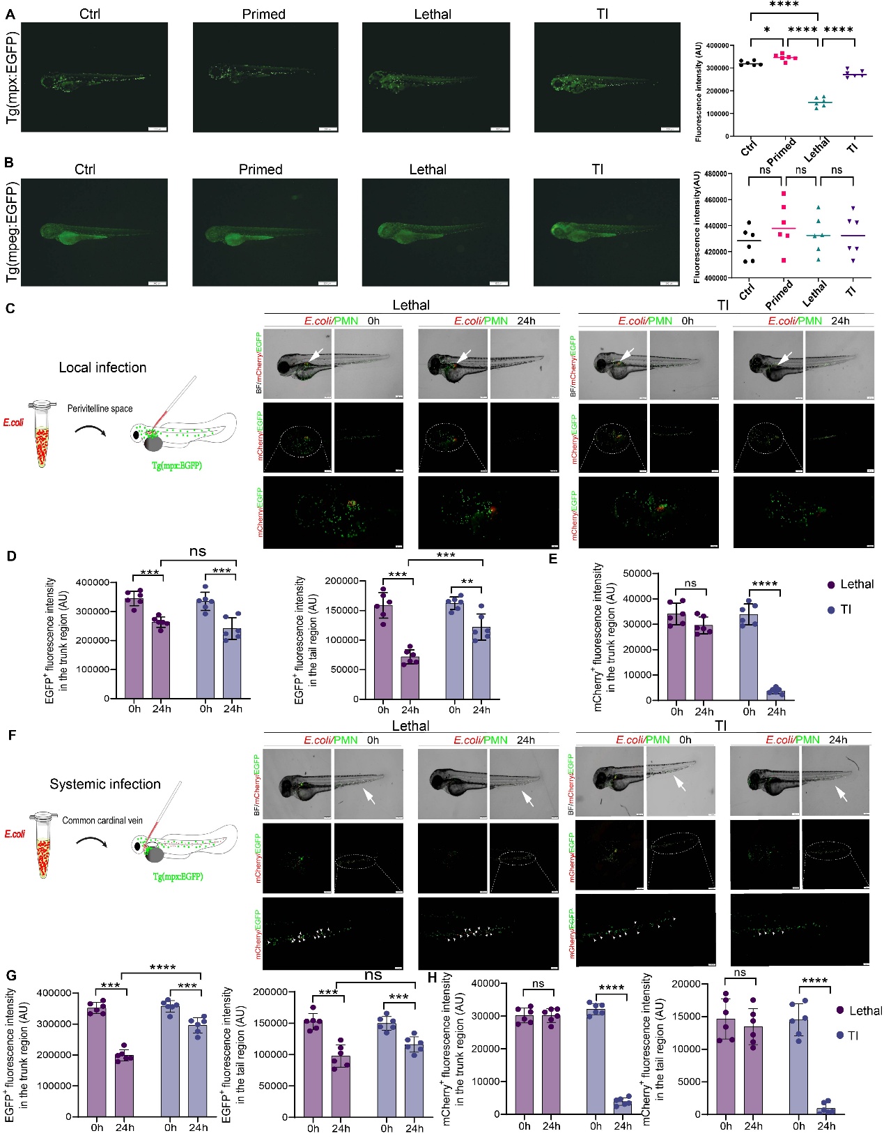 本研究首次发现,低剂量细菌预刺激中性粒细胞内Irf5信号激活,并使其在致死性二次感染中分化为Cd274⁺(免疫检查点富集)和Fth1⁺(ROS适应性)两个功能增强的终末亚群,显著提高细菌清除能力和宿主生存率。该机制在小鼠和斑马鱼中均适用,且对多种临床分离病原体具有广谱保护作用。该发现揭示了中性粒细胞“训练免疫”的细胞动力学规律,为开发宿主导向的抗感染治疗策略提供了全新靶点。