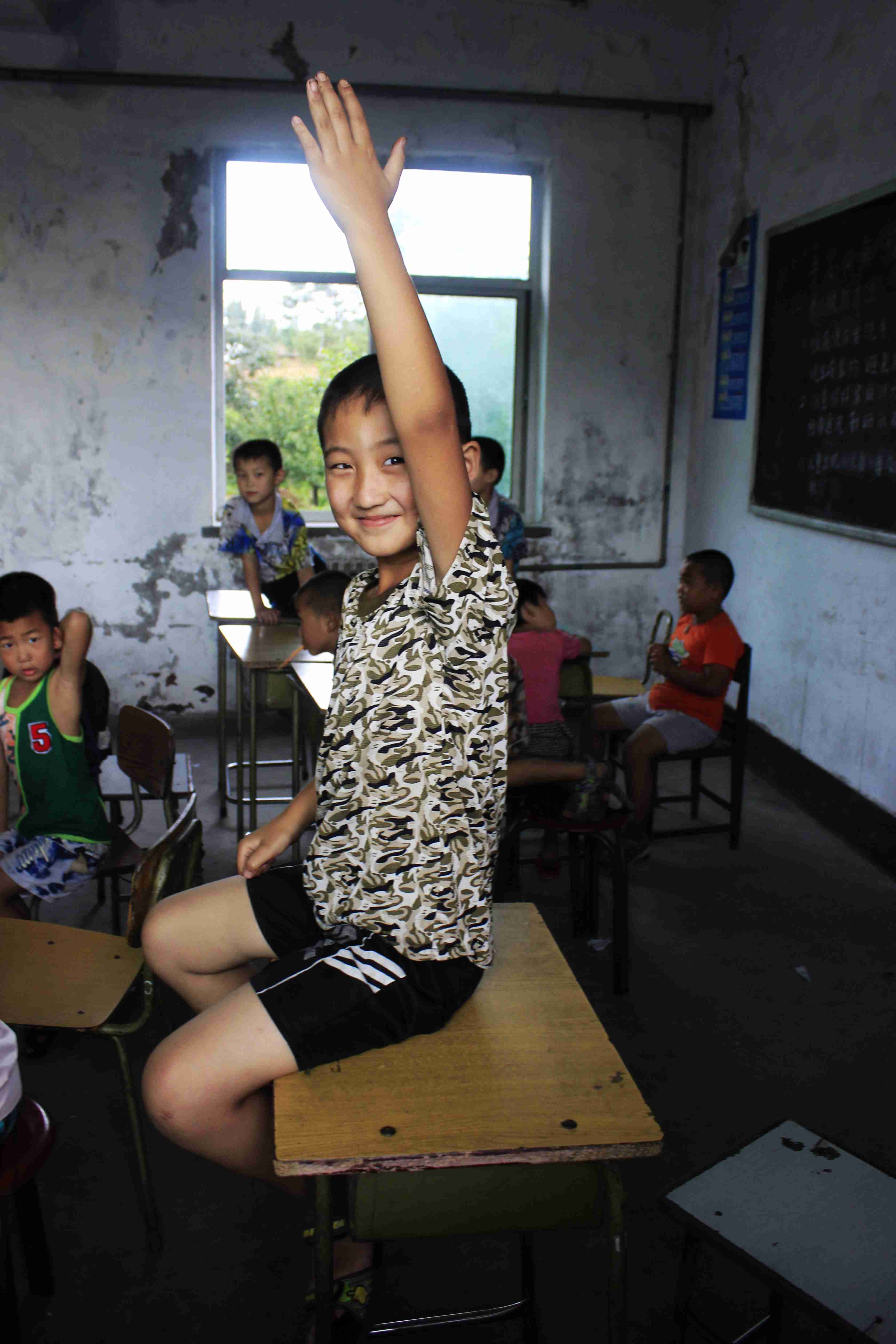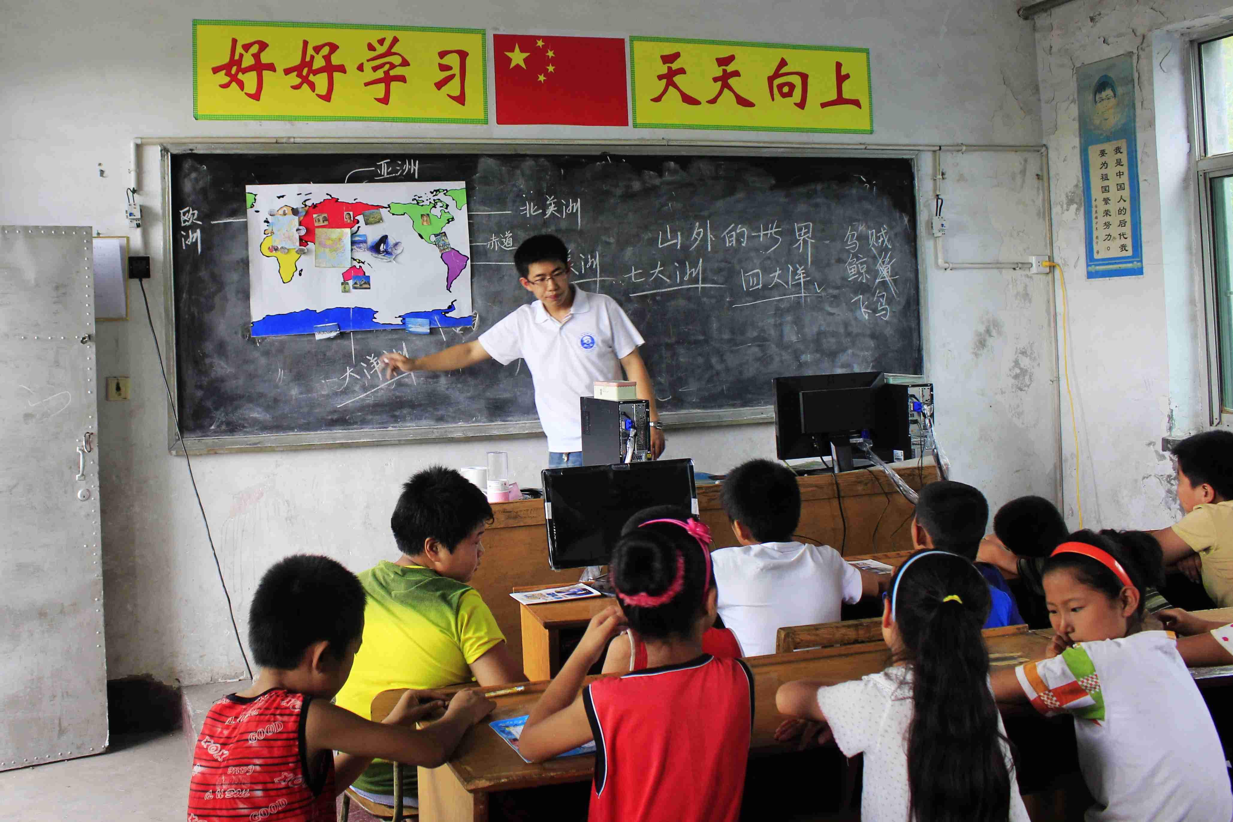 同时,在另一间教室,王子鸣则带给孩子们一节有趣的地理课。通过介绍七大洲,四大洋的特点和风土人情,告诉孩子们在大山的另一边有着多彩的世界。孩子们眼里闪烁的好奇心和强烈的求知欲令队友们非常感动。王子鸣告诉我们,有些孩子只能通过看电视了解很多海里的动物,他们只能通过电视来了解外面的世界,孩子们尽管平时很淘气,但学习起来非常认真,非常渴望走到山的另一边,也通过有限的途径尽可能的获取知识。