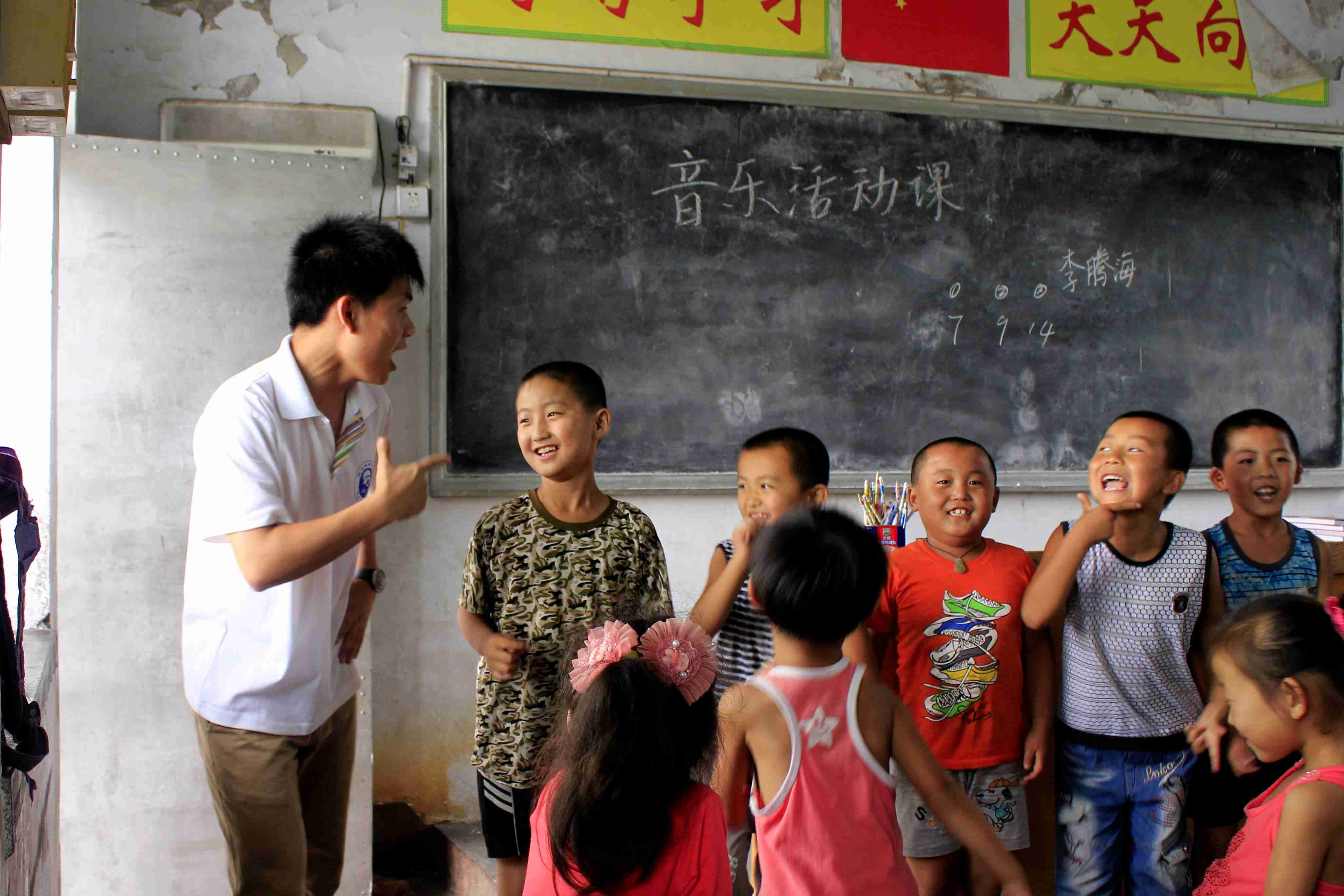 下午,李腾海带给孩子们一节生动活泼的音乐活动课。孩子们争先恐后地走上讲台,演唱《锄禾日当午》《年少志气高》等歌曲,还积极地教李腾海跳兔子舞,简单又可爱的动作仿佛把队员们带回了无忧无虑的童年时代。课后,李腾海感动地说:“每天都这样陪孩子玩,给孩子们上课,有时候很累,但很开心。只有你发自内心地尊敬孩子,孩子们才能反过来接受你,认可你。”是啊,孩子纯真的心灵是容不得任何欺骗的。社会实践小分队的全体成员正是秉持着这样的信念和热情,才能与孩子们这样融洽的相处,才能这样深受孩子们的喜爱和尊重。