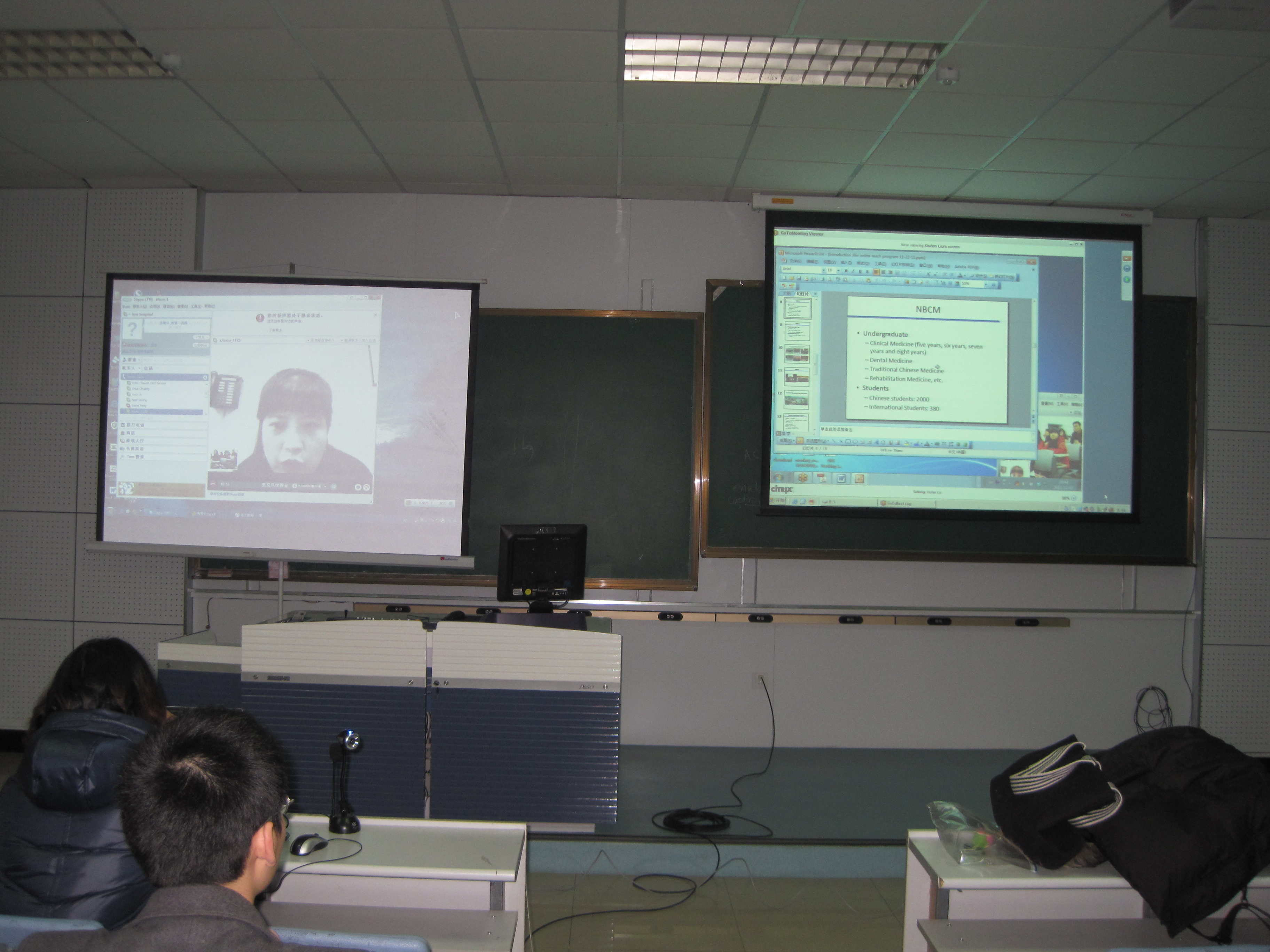 的专家参与教学。本次课程内容为“成年女性如何保持健康”,重点讲授了成年女性应定期做哪些检查、相应的国际参考标准等内容。采取根据案例所属学科,划分成不同的模块进行分块教学的模式,并在课堂上增设一个屏幕同步播放授课教师画面,犹如老师与学生面对面真切的交流。整个过程中美国教师的教学理念、模式和热情深深的感染着中外学生。授课结束后,同学们就本节课的病例展开了激烈的讨论,两个小时的课程同学们仍感意犹未尽。