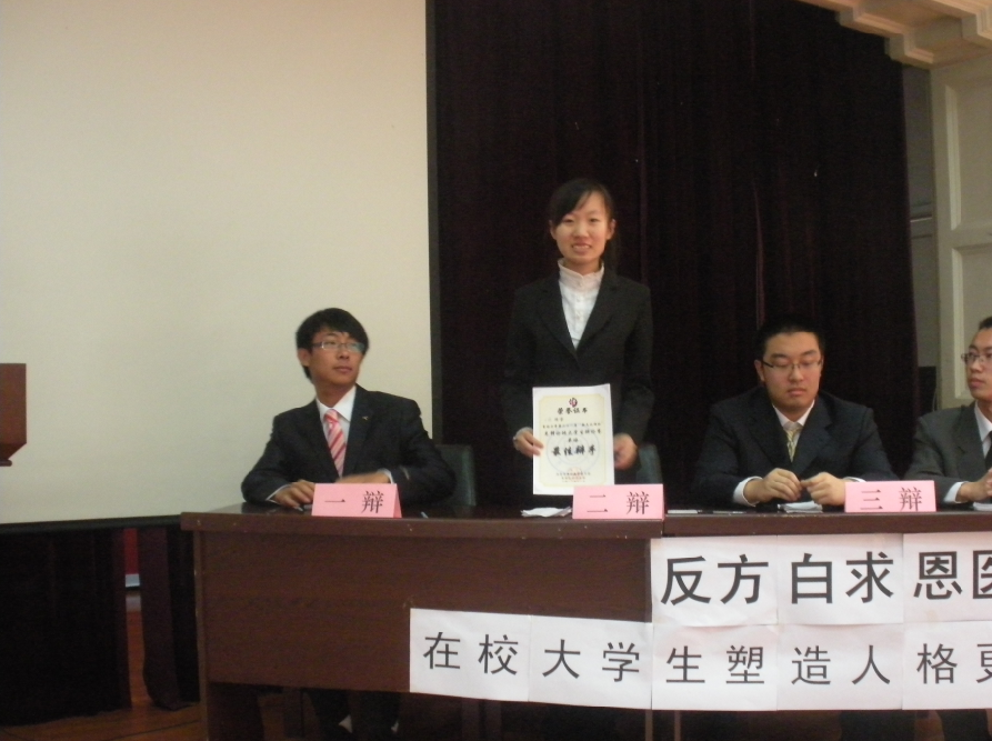 代表队。双方就“在校大学生应注重积累知识还是塑造人格”展开了激烈的辩论。