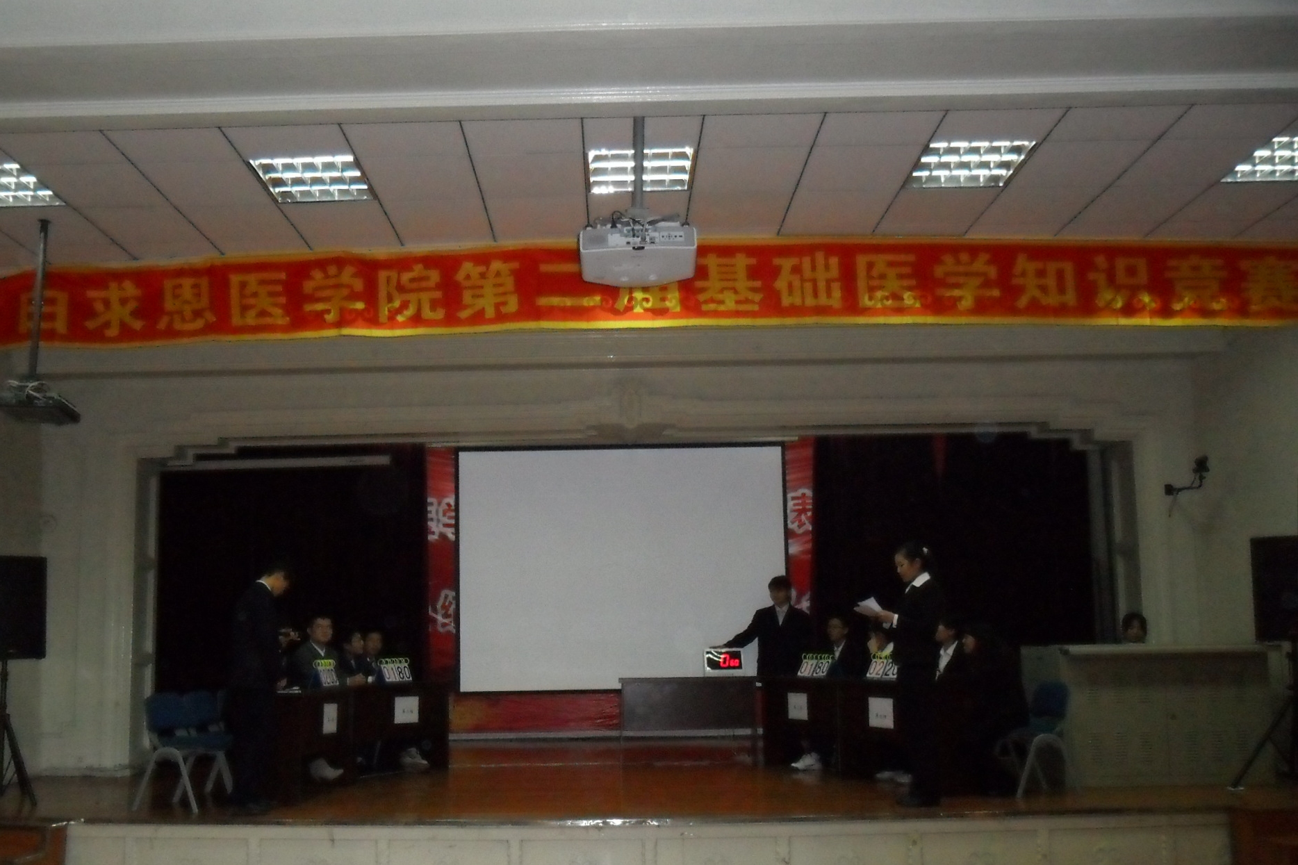 比赛分为必答题、抢答题、限时答题和风险题四个环节。比赛过程中,选手们运用丰富的医学基础知识灵活作答,表现出色,博得观众的阵阵掌声,观众参与答题也将现场气氛推向高潮。最后,评委老师对疑难问题的讲解更成为了整场比赛的点睛之笔,使同学们心悦诚服、受益匪浅。
