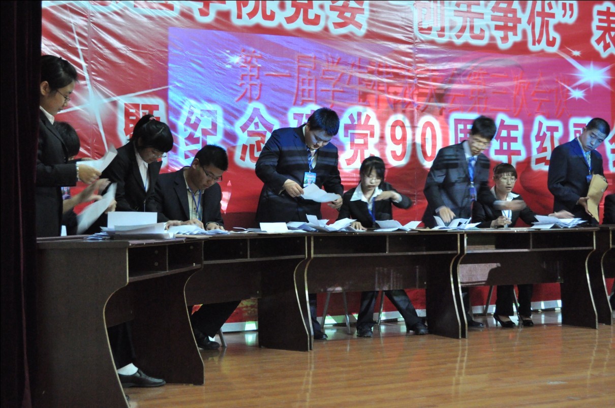 第一届学生代表大会第三次会议选举办法》,秘书长崔梦莹同学介绍了增补委员候选人情况。同时大会表决通过了李梓萌等14名同学任监票人、计票人。最终经过无记名投票、差额选举产生了于瑶、白皓天、刘相良、李荣昕、李羚、李腾海、张文嘉、张建鹏、姚浩琛、聂萍、原铭贞、高歌、黄浩澜、续晋宇14人为学生会委员,并与留任的3名委员组成新一届的学生委员会。