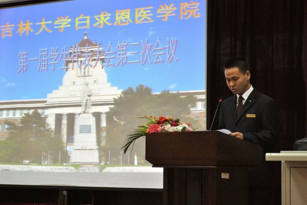 最后,大会在激昂的校歌中结束。整个过程中全体学生代表秉持负责、公正、严谨的态度进行表决与投票,充分体现了在学生代表大会中学生民主行使权利、学生代表学生这一基本原则。会后701004班的李博然同学感慨的说:“学生代表大会充分体现了学生的民主权利,相信在未来的日子里,白求恩精神一定会源远流长,白求恩学子一定会锐意进取,自强不息,荣辱与共!”