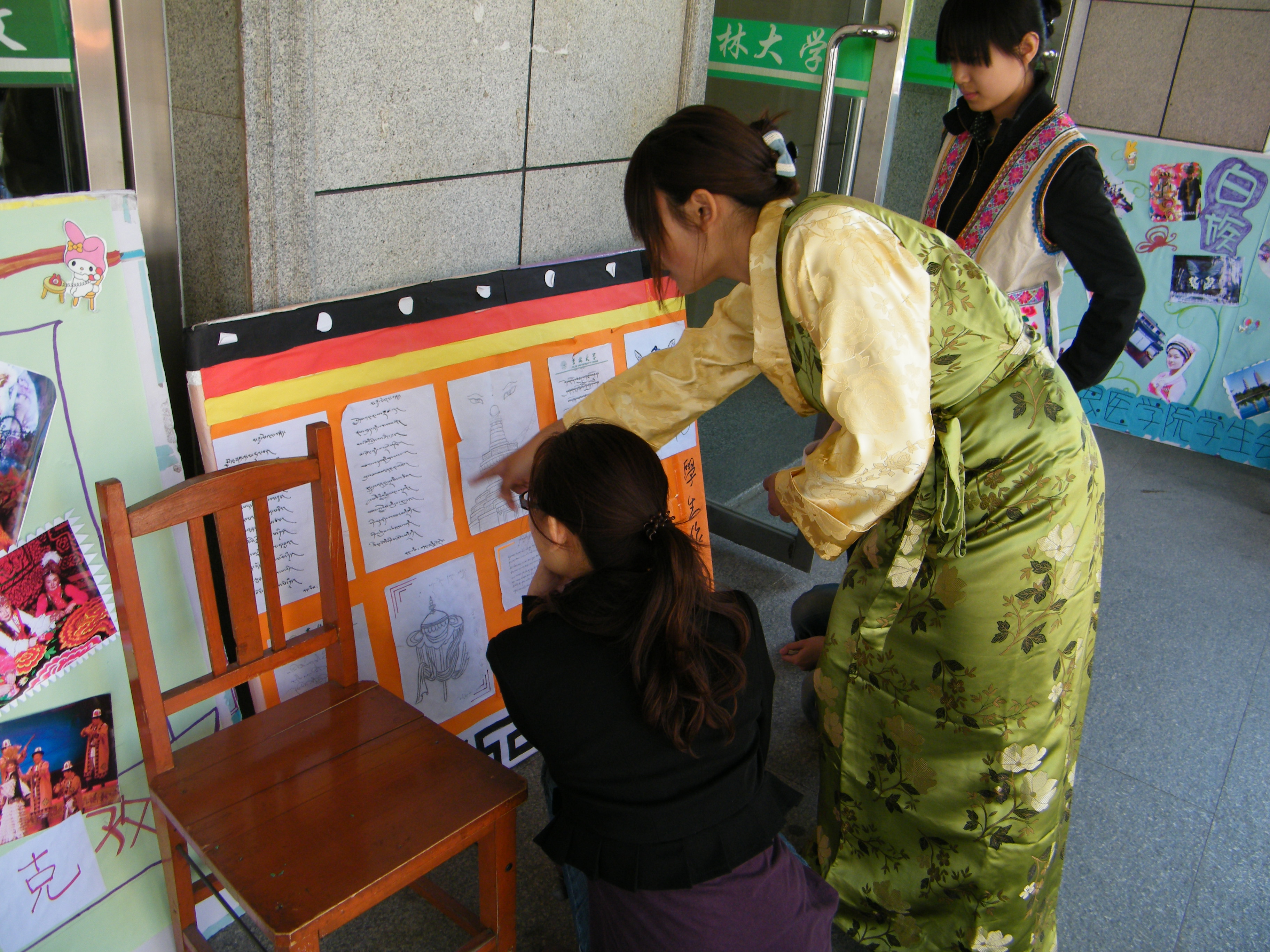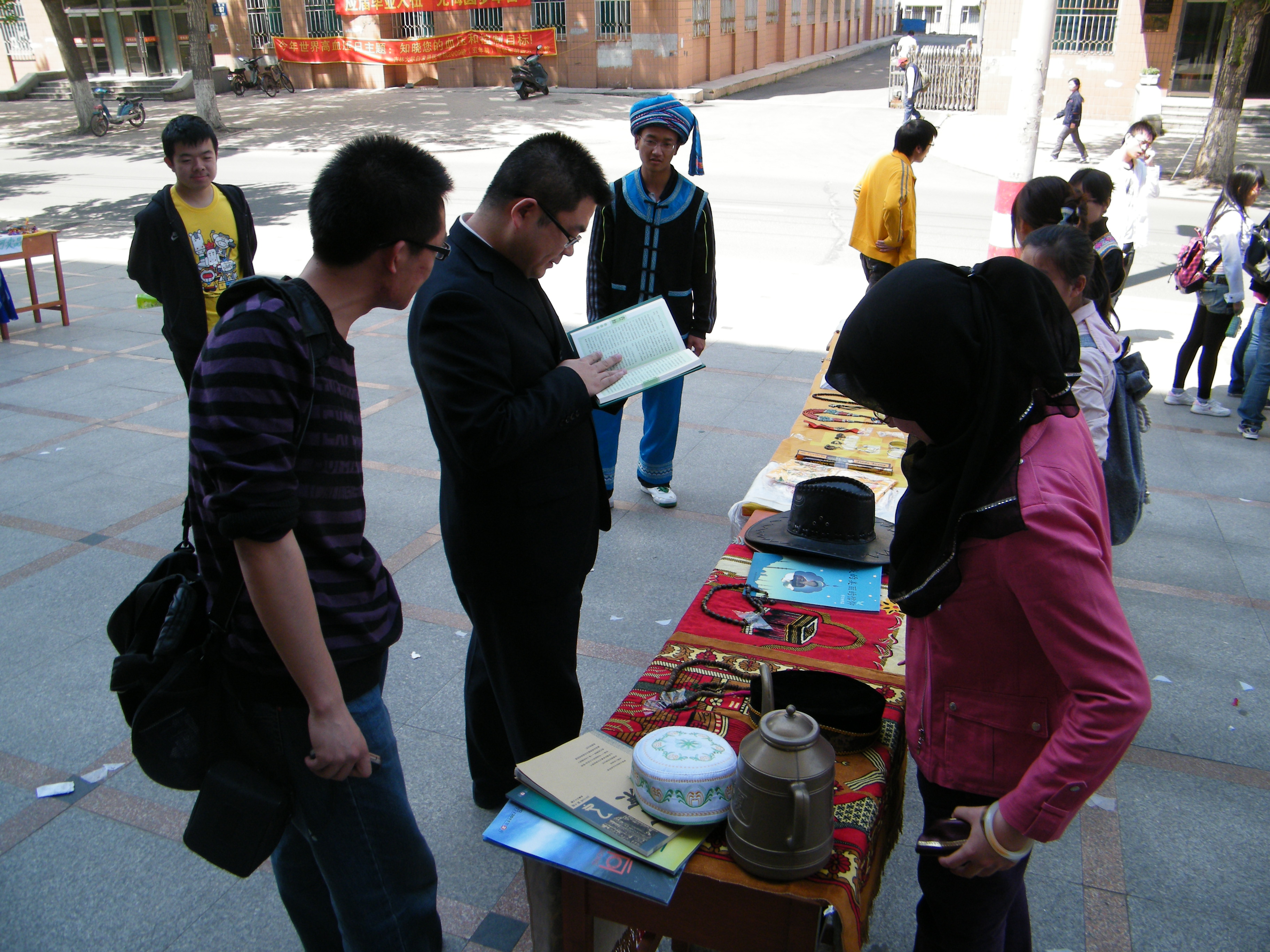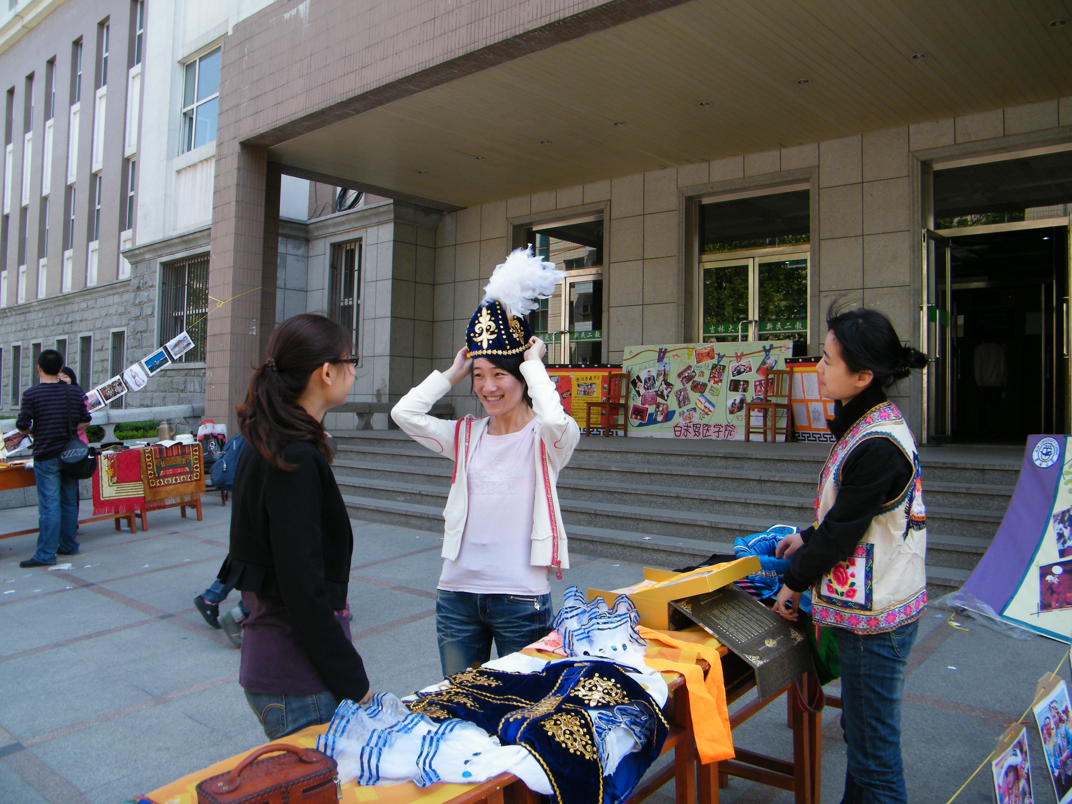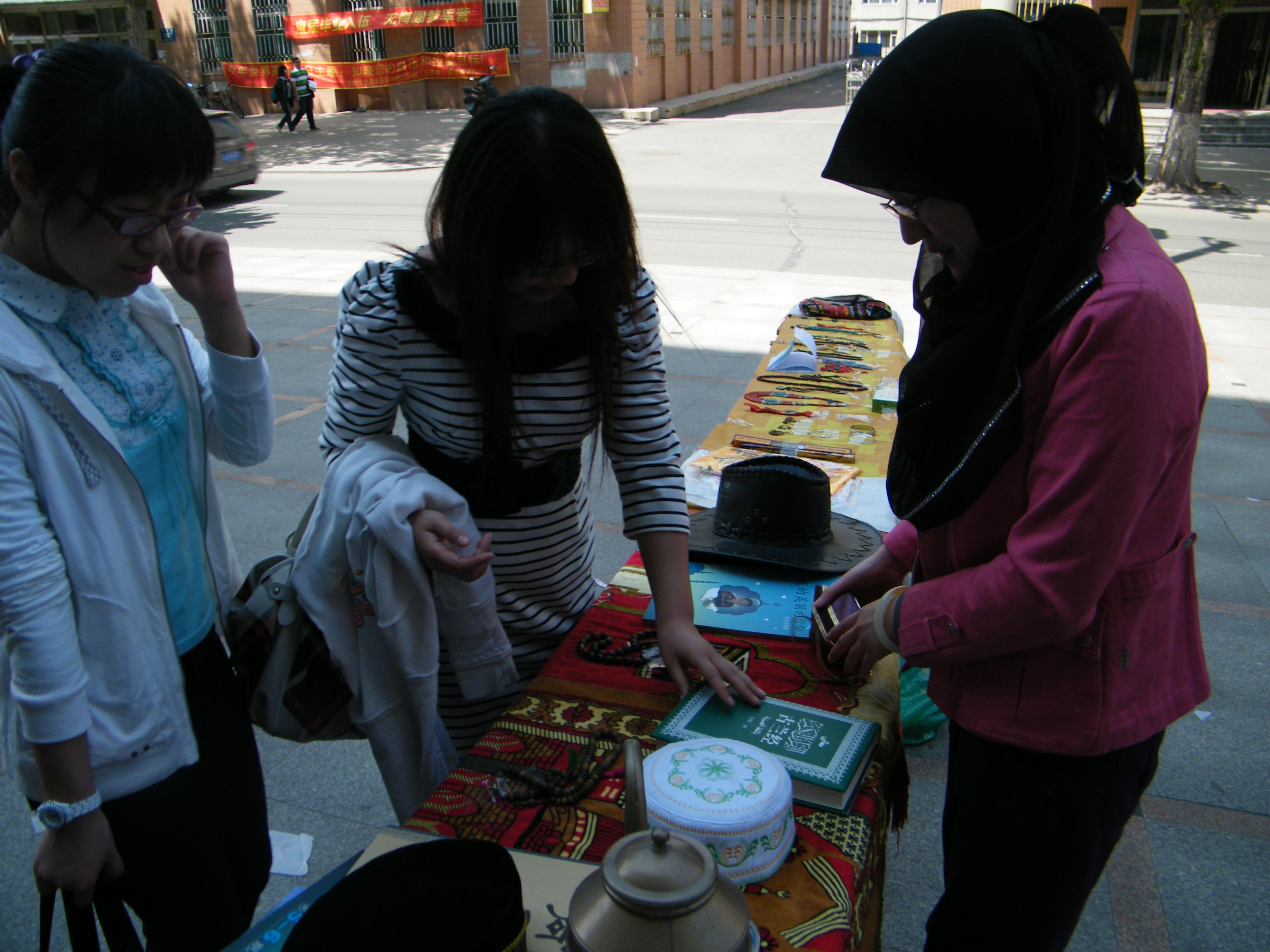 学生会少数民族工作部在新民校区第二教学楼外举办了一场少数民族风情展览。