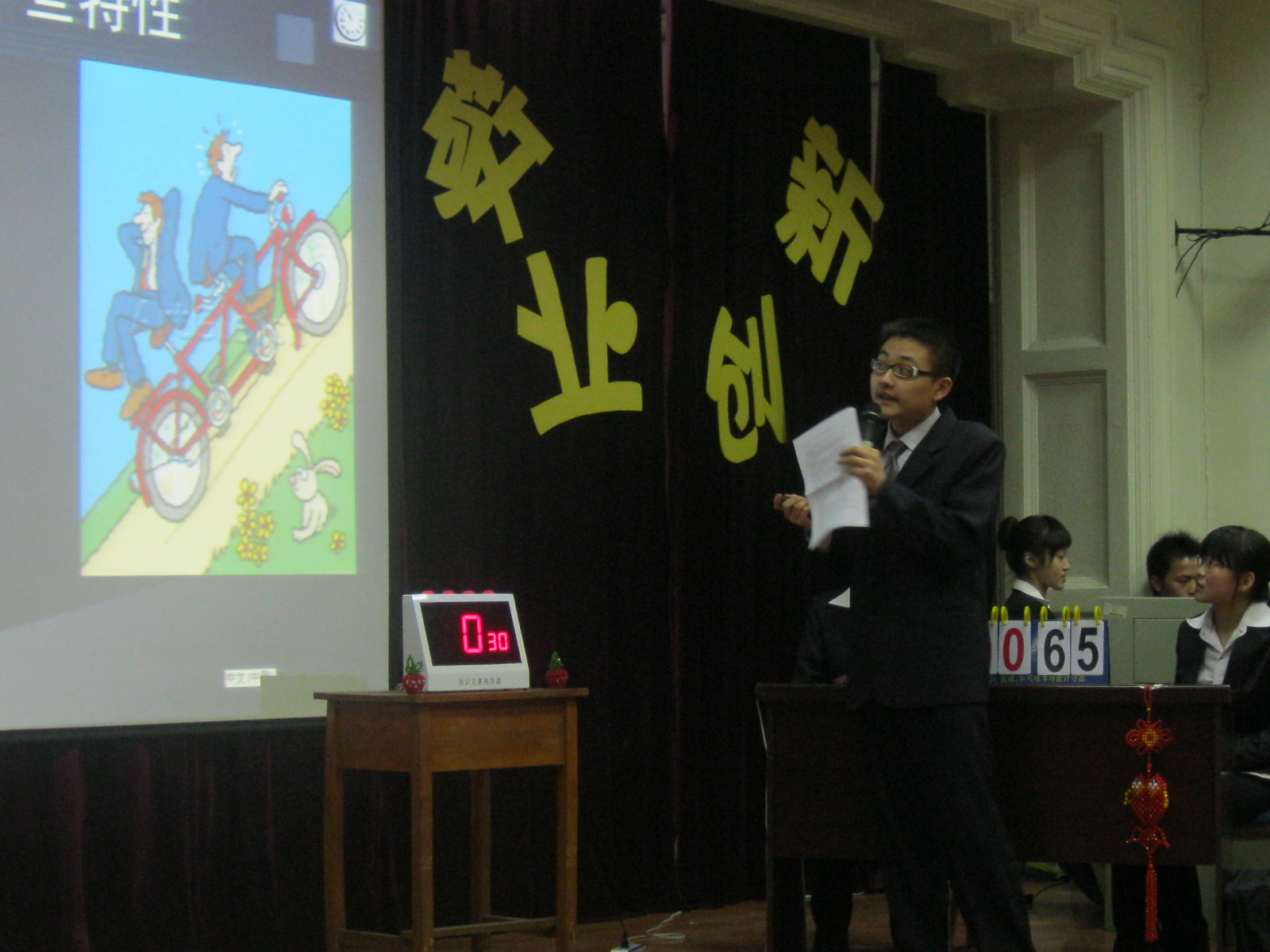 病原生物学系主任王丽教授、生物化学教研室副主任杨成君副教授、组织胚胎学系郝利铭教授担任比赛评委。700906班、700907班、700908班分别派队参赛。比赛共分为4个环节。第一环节是必答题,紧张的气氛笼罩着全场,台上的选手却镇定自若,场上的比分也没有拉开太大的差距。在第二轮抢答题中,各组选手你争我夺,尽情发挥,没有硝烟的战役在三个小组之间打响。第三环节是限时题,主持人快速读出题目,选手快速做答,场下观众屏气观战。