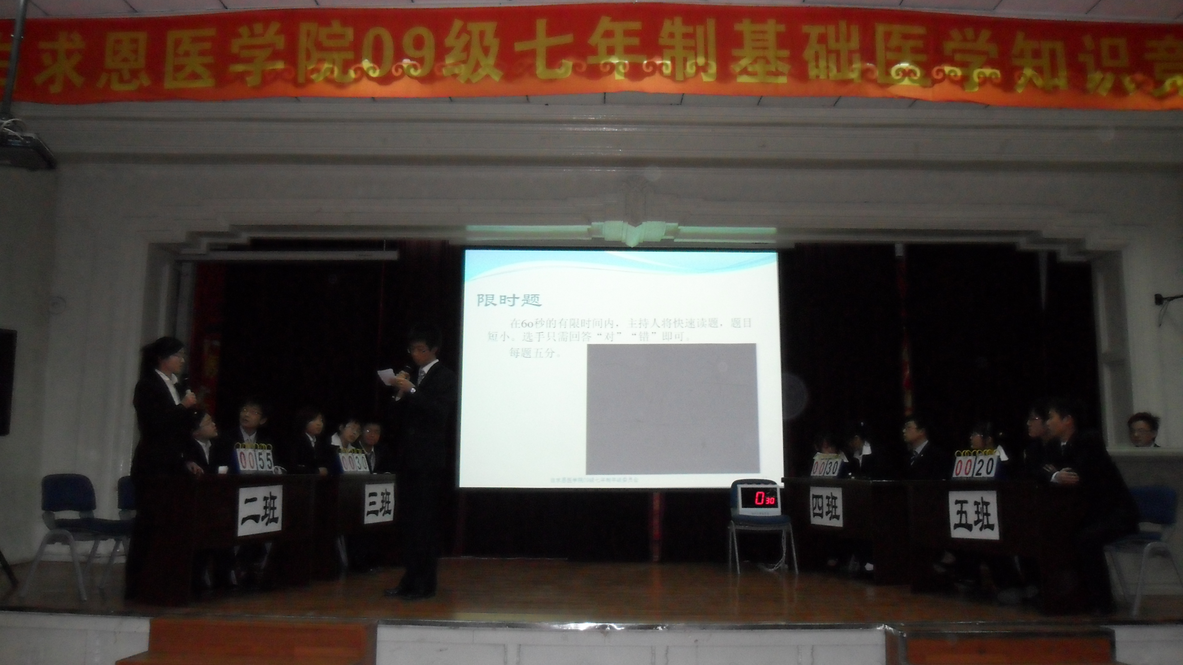 2009级七年制“基础医学知识竞赛”在基础楼二楼多功能学术报告厅举行。组织与胚胎学系主任周莉、生物化学与分子生物学系生物化学教研室副主任杨成君、细胞生物学系主任费瑞、生理学系张春晓老师、解剖学系夏长丽老师担任了此次竞赛的评委。白求恩医豪神娱乐城
