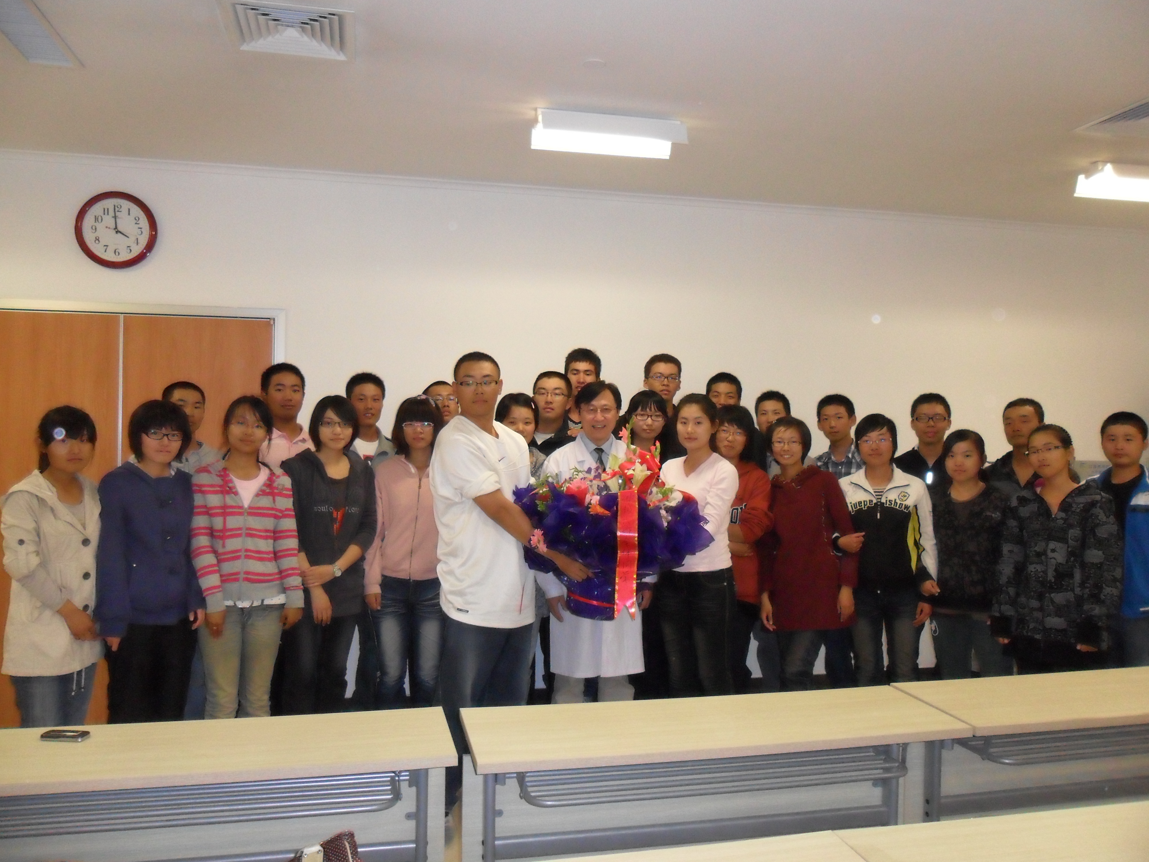 初次见面,701006班的同学用手语演唱了《感恩的心》,用鲜花和肢体语言感谢王教授关爱之情。之后,杜心静主持召开了班会,王教授讲述了他的成长经历,为同学们阐释了人生哲理,话语朴实简单却句句撼人心魄,更道出了王教授对年轻一代的殷切希望,让同学们受益匪浅。随后,在王教授的带领下,同学们参观了ICU病房,近距离的感受了临床医学的神圣使命。