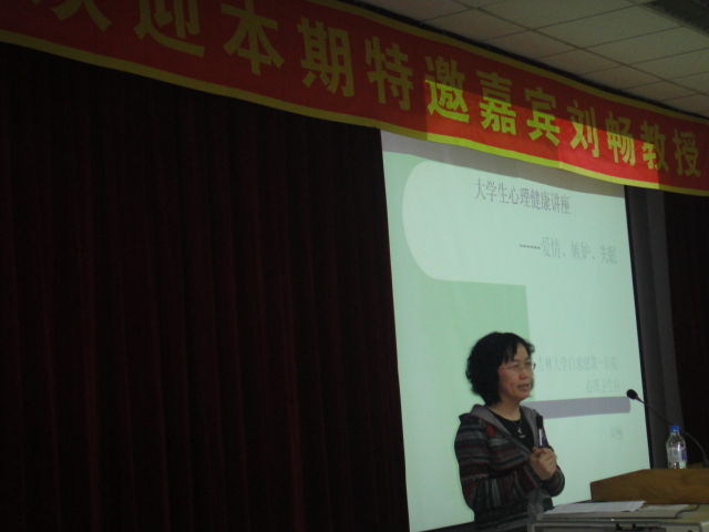 白求恩第一医院心理科主任、吉林省心理卫生协会副理事长刘畅应邀为同学们进行讲解。刘畅教授用朴实和蔼的话语,针对大学生心理上普遍存在的问题,就大学生应如何调整心态、合理定位自己,如何确立正确爱情观,如何对待嫉妒心理和失眠的心理疗法等问题与同学们进行了交流,并着重对大学生爱情观问题进行了深入的剖析。刘畅教授引用了大量临床病例,为大家切实分析讲解,使大家引以为戒,拥有一个健康的心理状态。