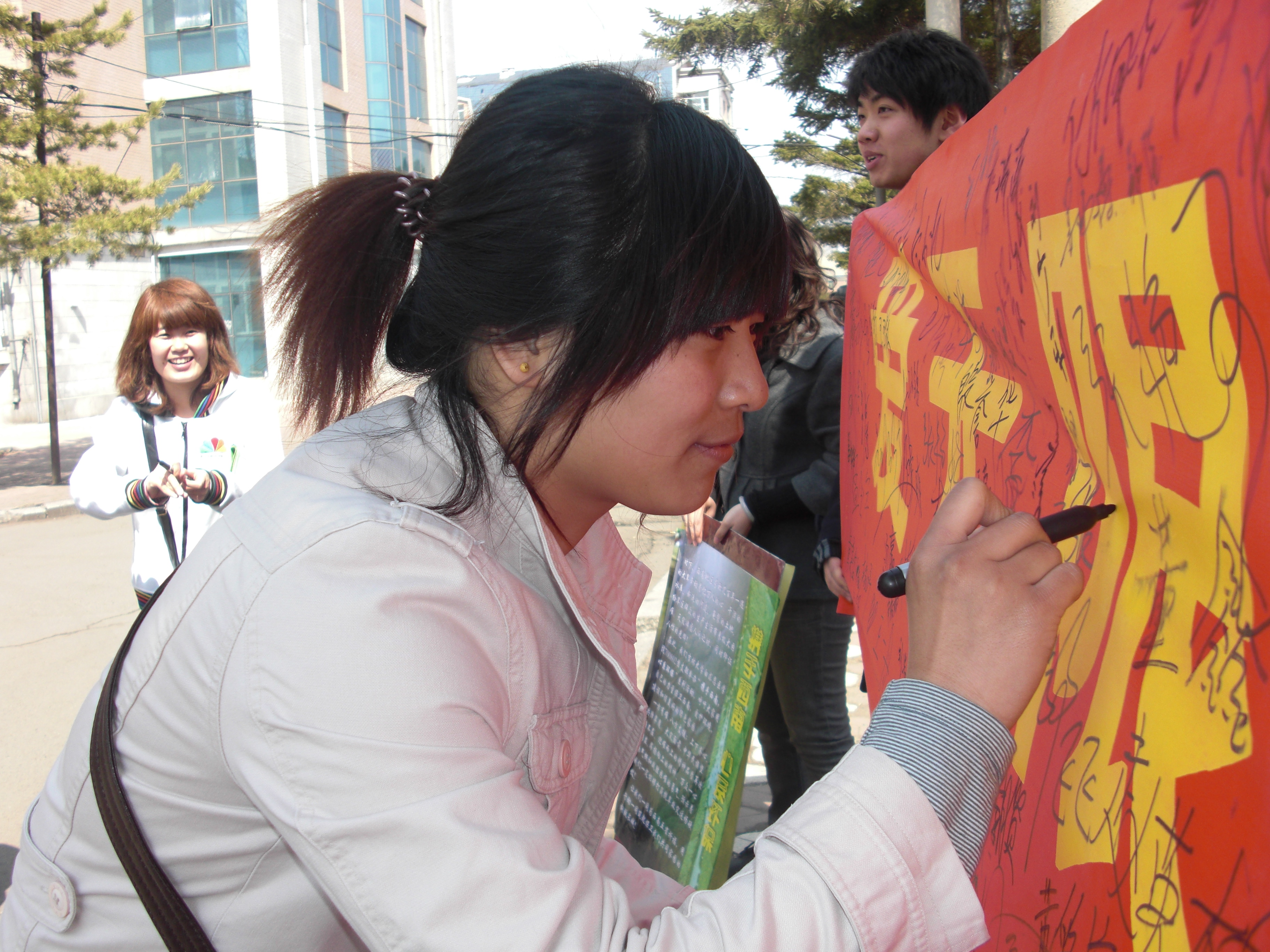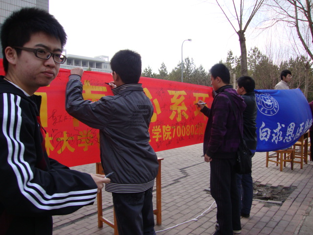 各校区、东北师范大学等长春市各大高校举行了联合签名活动,呼吁在长高校学生行动起来,用爱心与关怀串连成串,降成甘霖,滋润西南五省干涸的大地。“爱无限,绿无边,携手西南,心系环保”等条幅,满满签着的不仅仅是各大高校在校生的名字,更是一份份珍贵的心意,那是同胞之间的疼爱,是血浓于水的怜惜。