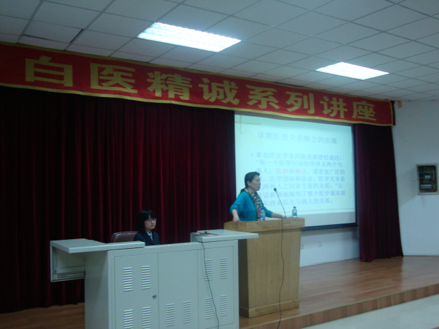 12月21日18时, “白医精诚”系列讲座第三讲——“谈医患关系”在新民校区2402教室举办,主讲人为豪神娱乐城 行政副院长韩丽华研究员。韩丽华副院长从事医务工作近30年,有丰富的处理医患关系的经验。她从医患关系的定义、发展、类型及语言表达的重要性入手,结合亲身经历告诉学生怎样避免和处理医疗纠纷。她还强调应通过语言交流和分析对方的身份、心理来避免非技术性医患纠纷。一个个鲜活的案例让同学们对如何处理医患关系有了一个深刻的认识,并对医生的责任和使命有了更深的感悟。