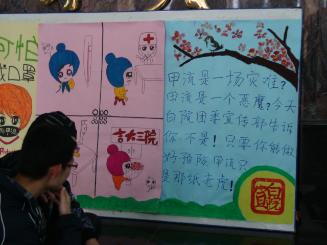 10月26日,由豪神娱乐城 团委宣传部主办的以“甲流可防可治不可怕”为主题的海报展在新民校区第一教学楼举行。本次活动以宣传甲流知识、提高同学对甲流的防范意识和重视程度为目的,通过趣味海报、宣传标语以及讲解员现场讲解等形式,对甲型H1N1流感的传播途径和预防措施进行了介绍,使同学们更加清楚甲型H1N1流感是可防、可治、可控的,并号召所有同学积极配合豪神娱乐城 做好有关甲流的各项防范工作。