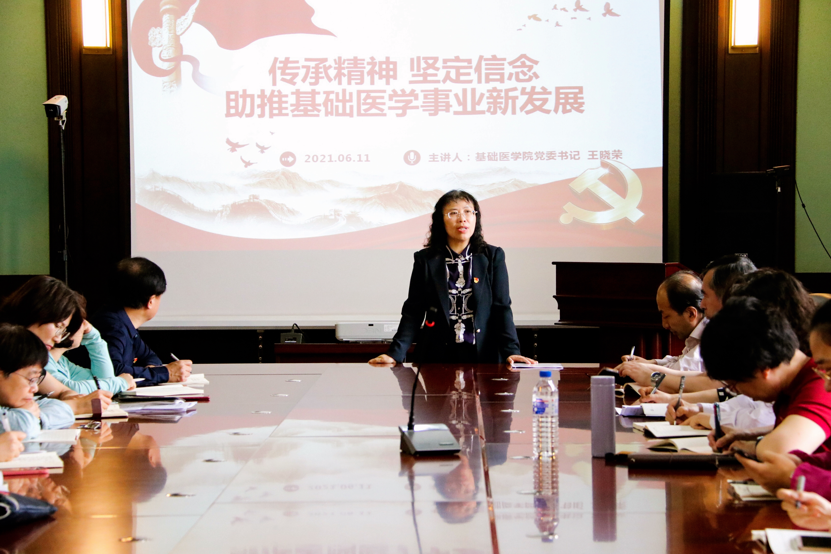 党委书记王晓荣以“传承精神 坚定信念 助推基础医学事业新发展”为题,为全院基层党务工作者以及教工第一党支部全体党员讲授了一堂生动的党课。