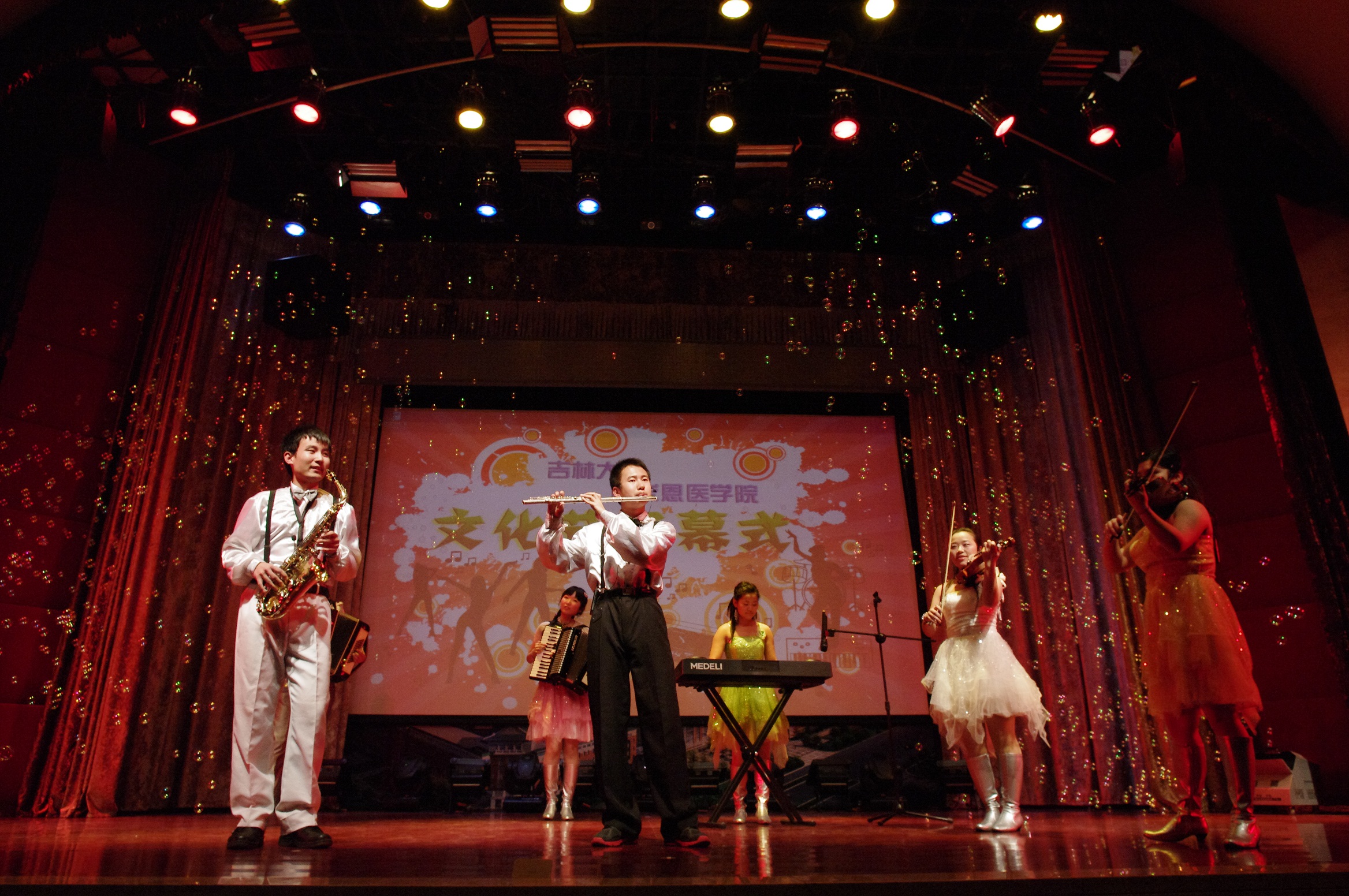 晚会由独具神秘特色的黑光剧《自由》劲爆拉开序幕。随后融为一体的《欢乐校园》展示了丰富多彩、魅力无限的大学生活;趣味十足、幽默搞笑的相声《我的大学生活》让观众开怀大笑;师生共同演出的藏族舞蹈《爱的火焰》赢得了阵阵掌声;经久不衰的音乐剧《音乐之声》插曲,在同学们的手风琴、小提琴、萨克斯、电子琴等合奏演绎下,舒缓优美、灵越动听;轻松搞笑的小品《龙门诊所》用诙谐幽默讽刺了不学无术、坑害百姓的庸医;歌曲串烧《青涩季节》演绎了一段浪漫的校园爱情故事;诗朗诵《荣光》再次唤起大家对伟大的共产主义战士白求恩最真诚的缅怀与最崇高的敬意,白求恩是一种精神,一份责任,一种奉献,它感染着一代又一代的白医人,让白求恩的孩子们谨记“健康所系,性命相托”的庄严使命,谨记“除人类之病痛,助健康之完美”的铮铮誓言,全场观众深受感染全体起立一同宣誓。晚会在庄重的歌曲《国家》中落下帷幕。
