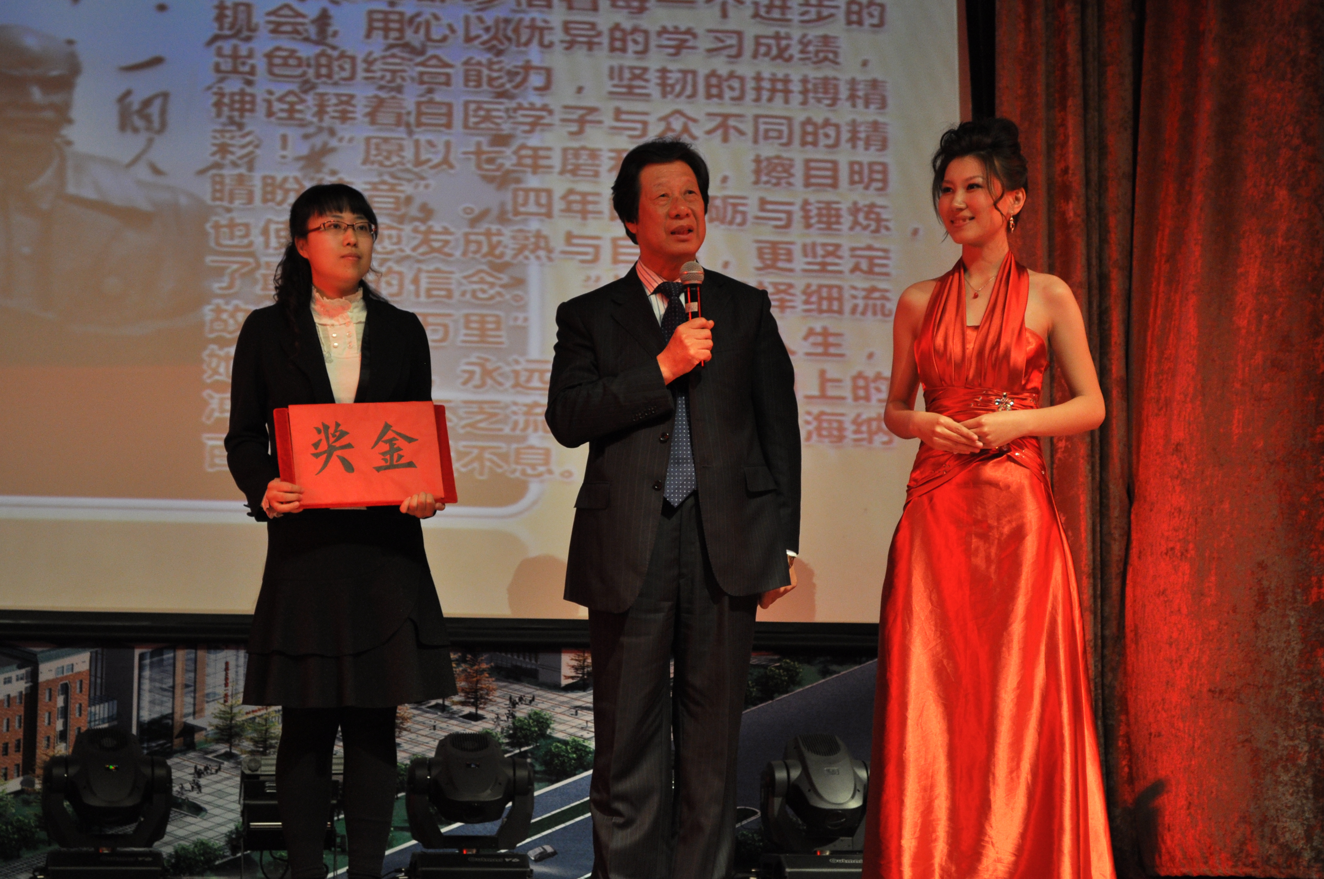 院长李玉林为王佳妮颁奖,同时号召同学们向她学习,努力拼搏,做一名白求恩式的卓越医学人才。(学生记者 姚鹏 狄宇 )