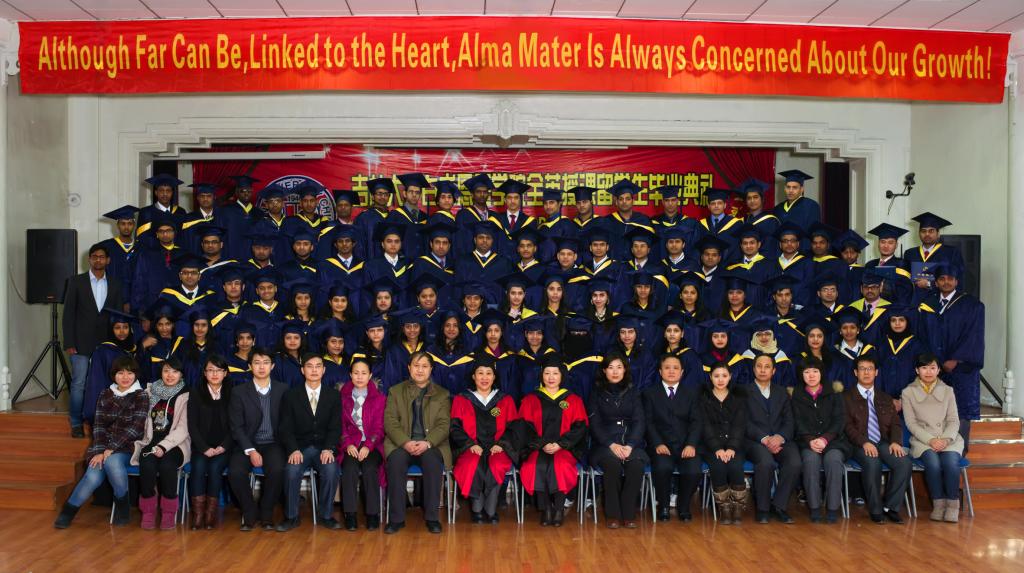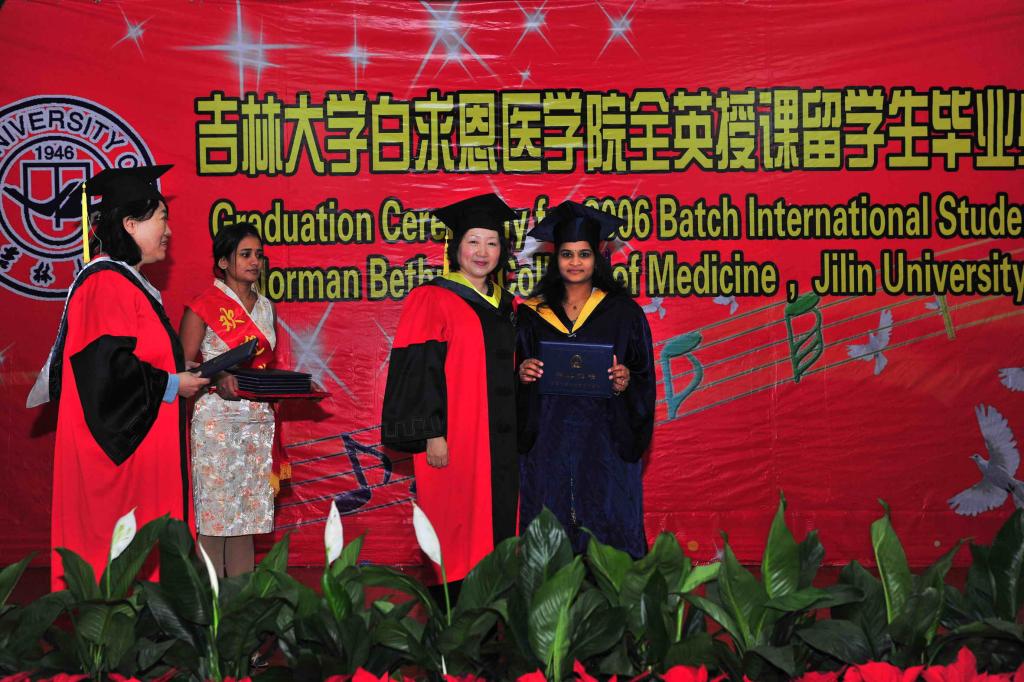 学习和生活的历程,师生们再一次感受到了留学生们的努力、成长与进步,同时也感受到了留学生们对教师及管理人员辛勤培养的感恩之情,每一个画面都感动了在场的每一位师生。教师代表李伟满含深情地讲述了在教学过程中师生之间的深厚情谊,并对大家寄予了新的希望。印度学生卡维亚代表全体毕业生表达了对母校的留恋和感激之情,描绘了他们梦想成为名医的理想。在校生代表阿布迪也送上了所有在校留学生们对毕业生们真诚的祝贺和美好的祝愿。最后,在教师代表杨洋的带领下,留学生们宣读了希波拉底誓言,更加坚定了成为一名优秀医生的信念。