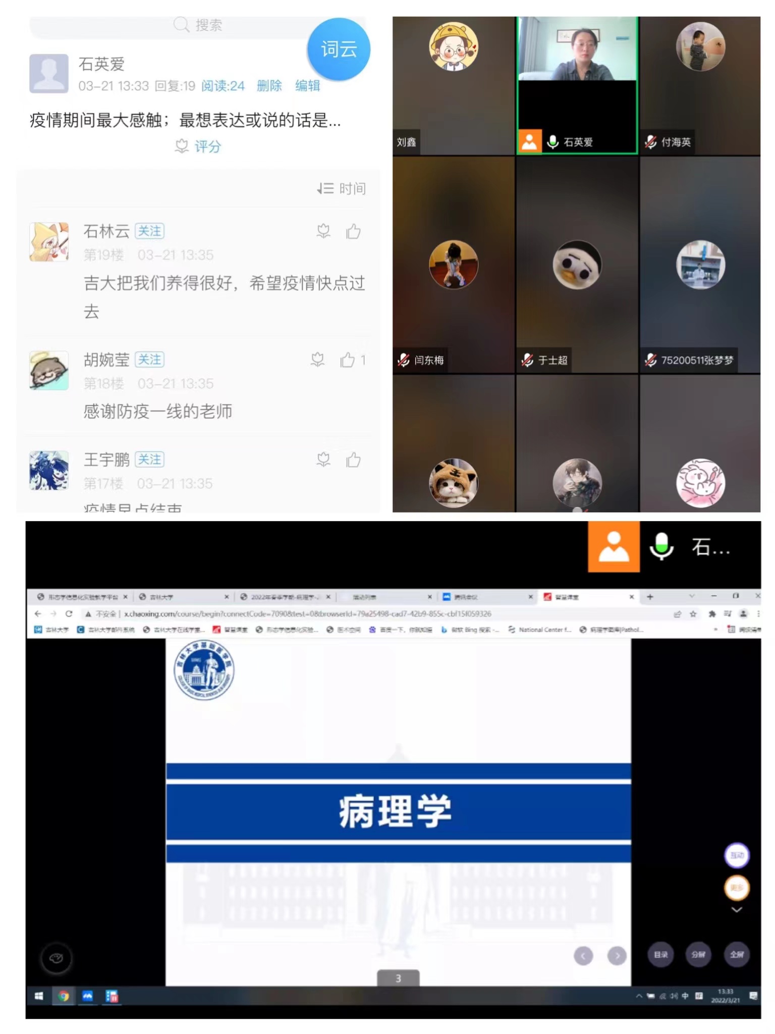 病理学实习课线上教学观摩选择的是石英爱老师讲授的“细胞和组织的适应与损伤”,上课伊始,石老师为各位同学和老师展示了一段吉大优秀学子制作的抗疫合唱视频,鼓励学生要坚信春天一定会很快到来;接着石老师通过病理学系建设完成的形态学数字化教学平台和虚拟实验资源指导学生在云端观察3D大体标本和数字切片,同时通过设计抢答、问答、学生展示等多项互动,调动学生的学习积极性;除此之外,还向参与观摩的老师展示了形态学线上实验的授课安排以及教学设计。在线上教学观摩的基础上,病理学系李艳茹老师又为豪神娱乐城