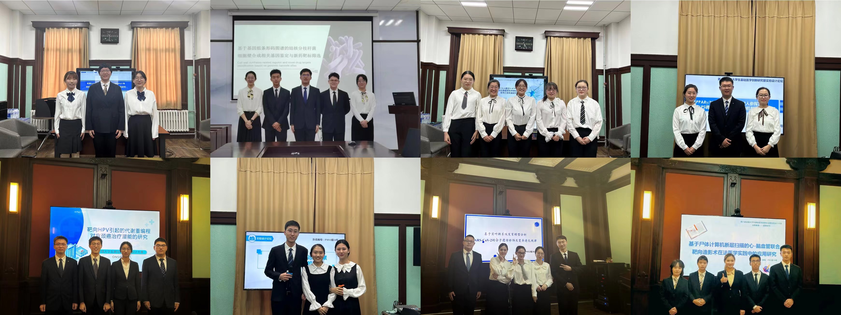 选派的10支代表队在汇报和答辩环节表现优异,获得一等奖7项,二等奖1项,三等奖2项。基础临床赛道中,刘晓瑞团队(指导教师:张灵)获得创新研究类一等奖;杜显龙团队(指导教师:李凡,王国庆)、侯媛媛团队(指导教师:刘佳梅,薛辉)和苏好义团队(指导教师:王国强,齐明然)获得实验设计类一等奖,王羽丰团队(指导教师:王医术)获得实验设计类二等奖;预防医学赛道中,倪玲团队(指导教师:辛卓远,刘雅文)和袁子迈团队(指导教师:李杨,胡远超)获得实验设计类一等奖;法医学赛道中,唐梦瑶团队(指导教师:陈志明,张明)获得创新研究类一等奖。以上8支队伍成功晋级决赛,希望同学们再接再厉,在国赛中再创佳绩。