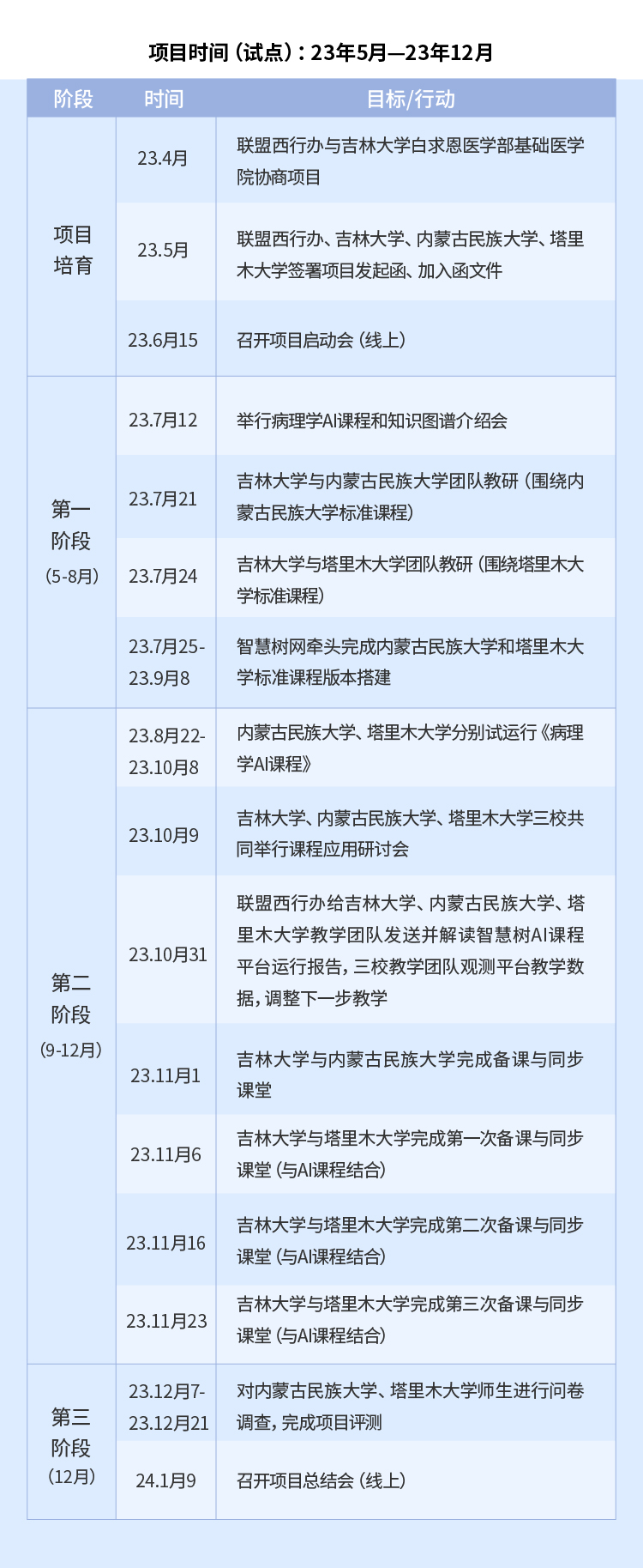 、塔里木大学、内蒙古民族大学、联盟西行办公室共同启动的《病理学AI课程》新形态教研西行(试点)项目是一次非常有意义的探索和创新实践。三校共有22位老师、12个班级、466名同学参与项目。该项目通过精准、小范围的跨校教学团队之间的共研、共建、共享、共创,建立了基于知识图谱AI课程的教、研、学共同体,较好地实现了西部行从以“输血”为主到以提升西部高校教师教学能力并使其投入实践教学的“造血”为主的阶段的转变。在数字化素养、课程建设及教研教学上给予了老师们新思路、新方法。期待在各单位项目组老师的共同努力下,提升病理学课程教研和教学的整体水平,将好的经验向其他课程推广,同时把虚拟教研做实做深。