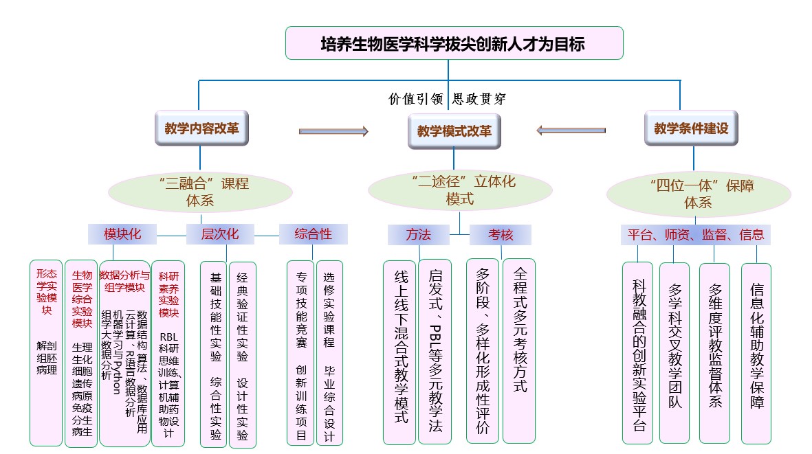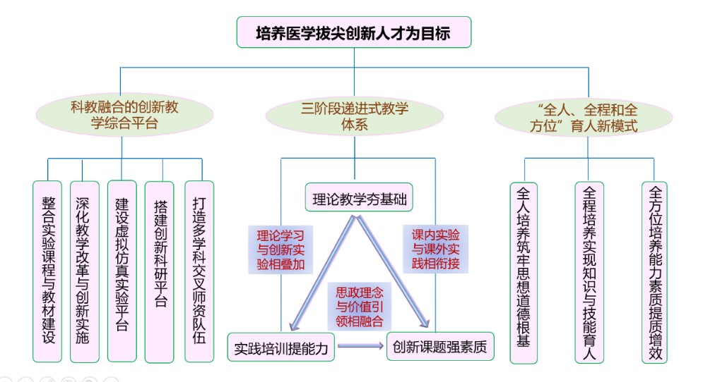 以“重基础,促创新,提能力,强素质”为教育理念,基于“课内实验与课外实践相衔接,理论学习与创新实验相叠加,思政理念与价值引领相融合”的原则,将科研能力培养融于教学环节,建设科教融合的医学创新人才培养教学平台与团队,打造“理论教学夯基础—实践培训提能力—创新课题强素质”的三阶段递进式创新人才培养教学体系,以“全员育人、全程育人、全方位育人”实现服务生命健康事业的创新型医学本科人才的培养。