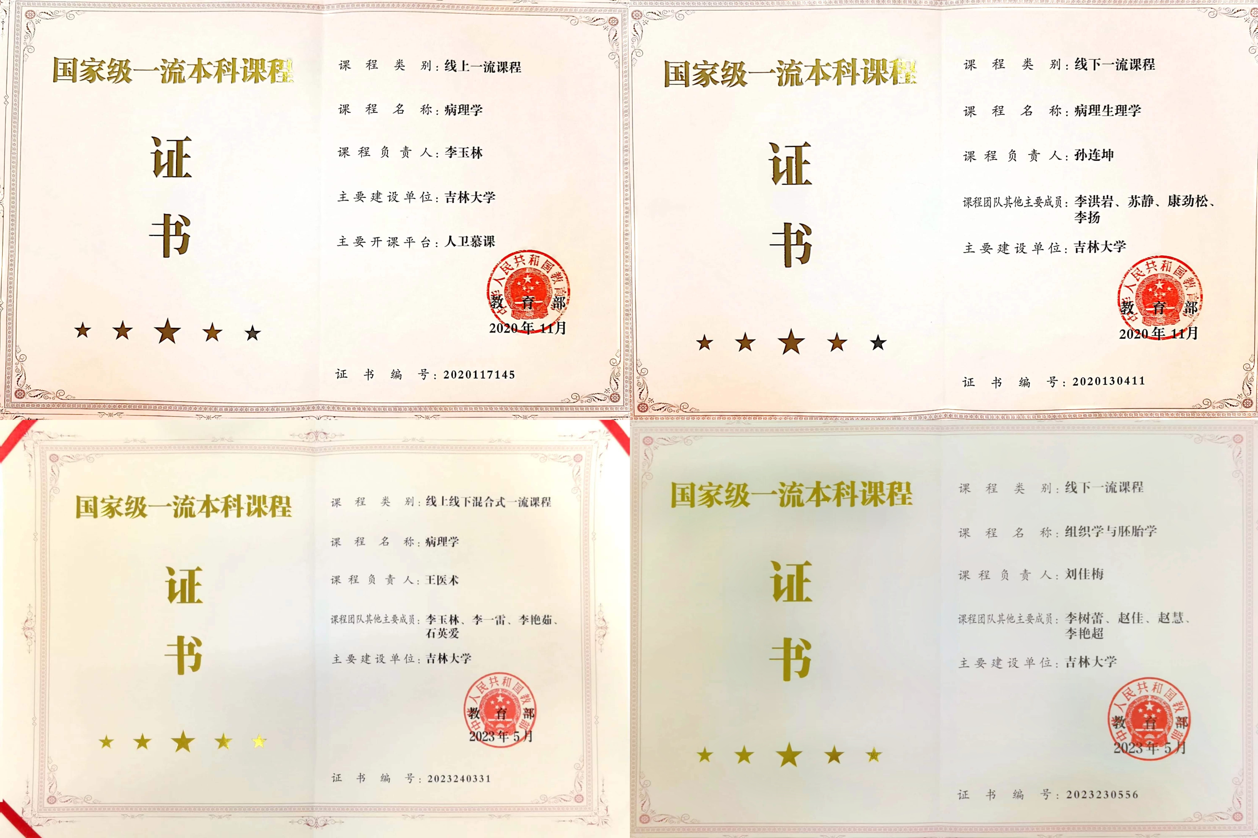 建设有4门国家级一流本科课程,1门国家级精品课程,1门国家精品在线开放课程,2门吉林省高校一流本科课程,2门吉林省虚拟仿真实验教学一流本科课程,9门省级精品课程,吉林省课程思政示范课程2门,吉林省课程思政建设课程1门。在2023年吉林省高校课程思政教学典范案例和优秀案例评选中,《病理学》被评为课程思政教学优秀案例,《医学免疫学》被评为课程思政教学典范案例。