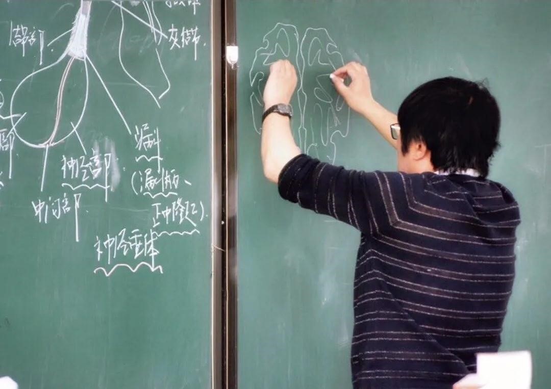 新民校区基础教学楼,略微驼背的李幼琼左手握黄色粉笔,右手握红色粉笔,双手同时画不对称的图,一个心脏结构便呈现在黑板上。不同颜色的粉笔画满了解剖结构、写满了注解。他用教鞭步步指引,慢条斯理地讲解,得到学生点头示意后,他便拿起粉笔又画下一个人体结构,开始讲解下一个知识点。