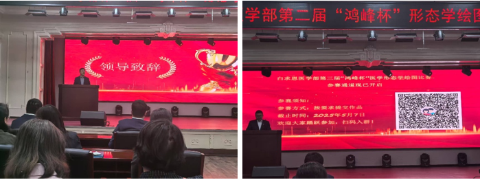 副院长杨明介绍了校赛中优秀作品在省级和国家级赛事的亮眼表现:省赛获得1等奖1名,二等奖2名,三等奖4名;国赛获二等奖1名、三等奖2名,并宣布白求恩医学部第三届“鸿峰杯”大学生医学形态学绘图比赛正式启动!
