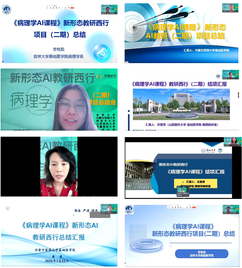 在项目中的经验与成果。会上,项目主持单位代表李艳茹副主任对二期项目的整体实施与运行情况作了总结汇报。项目自2024年4月24日启动以来,历时15个月,组织了8次教师教研活动、3次三校联动的学生同步课堂直播教学,完成了病理学AI课程的版本升级,新增了AI助教与智慧学伴等人工智能教学工具。项目实施满意度调查显示,90%的参与者认为二期项目总体成效显著。