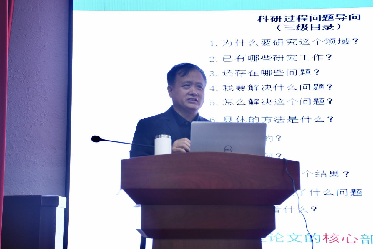 随后,孙连坤教授就科研能力提升对同学们提出建议。他强调,研究生阶段需主动培养自学与探究式学习能力,指出“写作是思想的锻造,而非知识的简单复述”。他提出“思想决定行为,行为决定作为”的观点,鼓励同学们加强独立思考,不断提升认知水平与思维能力,为后续论文撰写筑牢基础。