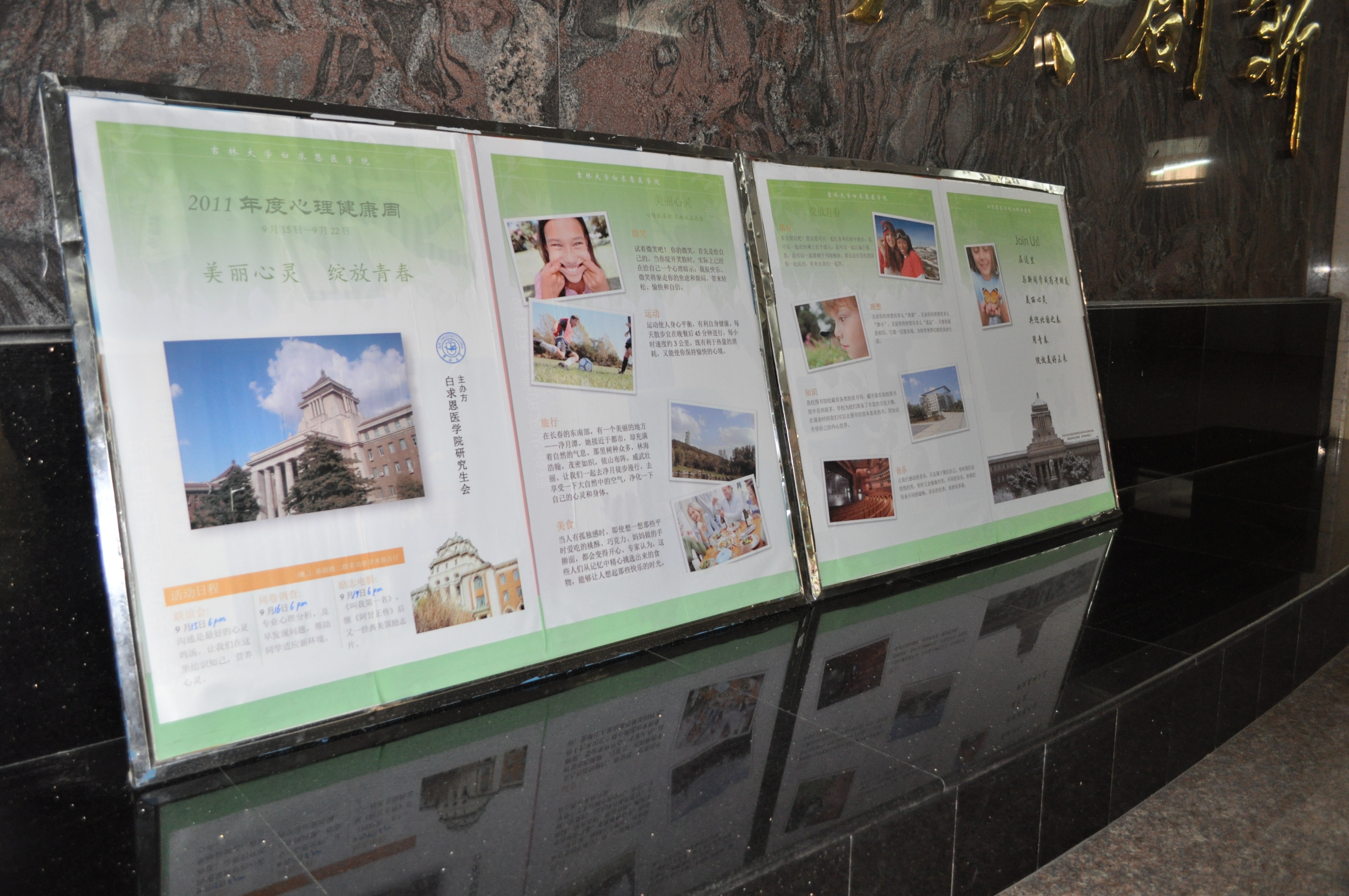 研究生会在新民第一教学楼外悬挂“关注心理健康,幸福伴你成长”条幅,引起广大同学对心理健康的关注。在新民第一教学楼门厅内展出“美丽心灵,绽放青春”为主题的宣传板,列举了一系列减少心理压力、保持心灵健康的方法。同时在2011级研究生中进行“SCL-90症状自评量表”问卷调查。通过多种形式的心理健康教育,研究生新生了解了心理健康知识,掌握了必要的心理调适方法,为形成正确的心理健康观念提供保证。